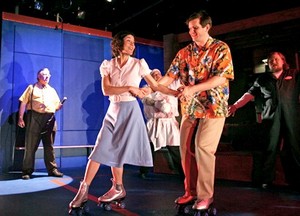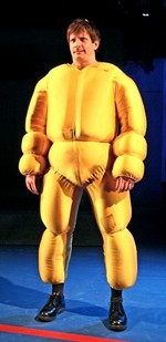 Things do not, however, remain at this rarified level for long: Yul is a determined anti-consumerist with a thyroid "in a state of perpetual atrophy," which has rendered him slow and slurred of speech; Sadie can't conquer her own innate fears of fighting through life unaided, and has a liking for visiting a bar where extreme karaoke not only involves singing wholly original song but requires it. How lucky that Yul once formed his own one-man garage band, though his winning doesn't sit well with the mean-spirited butcher (Joel Marsh Garland) who scowls over the club when he's not convinced this outsider is to blame for the town's missing kids. What ensues would be a battle of wits if any of the characters had them. But with the exception of the bar owner and her Russian poet husband (Cheryl Lynn Bowers and Michael Chernus), who are presented as firmly (if bizarrely) grounded in adult concerns, everyone is a juvenile trapped in an adult's body. And, like children, they've constructed elaborate emotional barriers around themselves to prevent them from having to deal with each other in realistic terms. Even the real children who've been disappearing cannot necessarily be taken at face value. Rapp's cynicism and critique might cut deeper if his characters' excessive eccentricities didn't seem like his own method of avoiding honest human interactions. But everything they say and do is toxic only for toxicity's sake, never leading (as similar tactics did in his lacerating Blackbird did) to lucid insights or an analysis of the paranoia and phobias by which all these characters govern their lives. Yul's pithy epigrams, for example, reek less of his dissatisfaction with the country's imploded priorities than Rapp's forced attempts at cleverness ("Love is an erroneous myth created by the Hallmark Corporation" is Yul's most level-headed conspiracy theory; "I think sometimes people fall into holes and sometimes the holes close" is his overriding worldview), and Rapp devotes so much time to exploring everyone's weird need for weird safety, he leaves himself no time to explore their hearts. Sparks and Goldenhersh fulfill those chores well enough, and almost succeed in making their characters function as the eccentric center of their ulcerated society; Guy Boyd also has a few glimmering moments of something resembling compassion as Yul's paternal barber. But neither they, the firm direction from Carolyn Cantor, nor the Norman Rockwell acid trip of a set by David Korins can make Bloggs feel more like a city under siege than a vomiting question mark, the product of a world gone wrong merely because people exist in it. Fans of Rapp's other plays will recognize this as the message of a majority of them. But no new dialect or bizarre speech impediment can change the fact we've heard all this from Rapp long before he and Essential Self-Defense donned their padded suits.