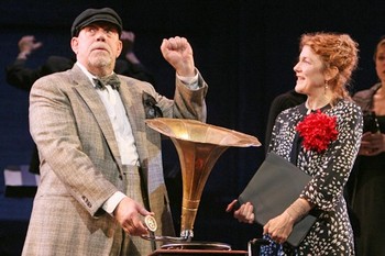 Even in this trimmed-down version, however, Juno does no similar favors to O'Casey. For while Blitzstein's songs jig, waltz, celebrate, and sear, they can only do so much to elevate a play that's determined not to sing. O'Casey's original, set during the Irish Civil War of 1922, is a bleak and unyielding journey to the outer reaches of despair, in which the Boyle family of Dublin is ripped apart much as the culture around them is. Though Stein's book for the musical maintains most of the play's tragic overtones, it's set a bit earlier, a lot safer, and considerably more brightly, which make it both more-accessible and less-devastating drama. Juno Boyle (a smoldering Victoria Clark) sings not only of her weary lot as mother, but trades quips with her do-nothing husband Jack (Conrad John Schuck) as if she's passing the salt for the meat. She also leads a sing-along in rapture of the sizeable inheritance a relative has apparently left the family, and duets on a touching "madrigally" with her stubborn daughter Mary (Celia Keenan-Bolger).