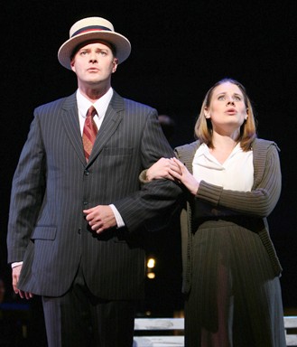 More central, but hardly better defined, is the story of her brother, Johnny (Tyler Hanes). A member of the Irish Republican Army under suspicion for bringing about a comrade's death, Johnny is musicalized mostly in abstract ways (he does not sing) until his responsibility-driven rage explodes into a ballet in the second act. The emotionally expansive "The Ballad of Johnny Boyle," simply but vividly choreographed by Warren Carlyle, powerfully summons to the surface the nightmarish fantasies and fears that fuel the guilt-riddled Johnny through his tortured existence. The ballet also represents the only time this musical goes somewhere its source play cannot, which is why it succeeds when so much of the rest of Juno fails. If Blitzstein captures the tense excitement of the Dublin tenements in many of his songs, even those with at best a tangential relationship to the plot (there are far too many numbers for a quartet of busybody women), too many are either unnecessary or witheringly conventional when more acidic specificity would be ideal. But with Hynes's take-no-prisoners staging, which keeps the specter of violence always at the forefront; Eric Stern leading the sumptuous, 30-piece Encores! Orchestra and this superlative cast, reservations melt away almost as soon as they form. Clark's put-upon, burnt-out Juno all but reeks of the smoke and refuse of her life, but is nonetheless blessed with a well-honed wit that proves how she preserves her sanity in these maddening conditions. Schuck is the comic epitome of gruff laziness, just right for Jack and convincingly challenged by the headstrong woman he must face down at every opportunity. Keenan-Bolger brings an appealing steadfast innocence to Mary, though her highest notes ring slightly on the shrill side. Arden and Thorell make appropriately endearing suitors for her, while Dermot Crowley makes a thoughtfully funny drinking and carousing buddy for Jack. Hanes's line readings are occasionally on the harsh side, but his acting and dancing during his ballet are exquisite. Members of the ensemble stand out as well, with J. Maxwell Miller and Kevin Vortmann unleashing some astonishing vocals during the second act's lengthy opening scene. Whether they need to in their respective roles as ghostly figures charging a gramophone and Johnny's most malevolent demons is another issue altogether. But under the Encores! circumstances, it's worthwhile to give them the benefit of the doubt - this is a score worth savoring even if the show containing it has little unique flavor of its own.