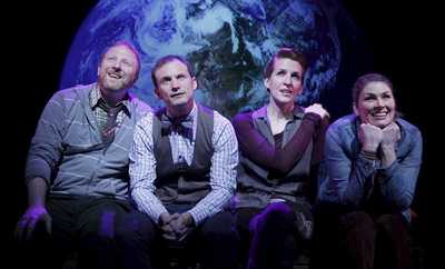 This state of affairs is less contradictory than it might seem. Anyone who saw [title of show], whether in its first and best incarnation at the inaugural New York Musical Theatre Festival in 2004, at the Vineyard in 2006, or during its brief Broadway stay in 2008, knows that this sextet is unusually capable of making the quirky seem as natural and inevitable as taking a breath. That the actors are immensely likable, and not conventionally overpolished (at least by current musical-theatre standards), only adds to their freshly convincing "kids-next-door" appeal. And when the four of them, being themselves (or a reasonable stage facsimile thereof), are positioned at the absolute center of this show, all is right with the New York theatre world. Within the confines of the current theatre season, for example, it's tough to find a musical number more instantly endearing than this show's "That Makes Me Hot." It's not what you think: The subject isn't sexual stimulation but, as Bell clarifies, "those moments when you're slammed into the now, here, this quite unexpectedly and it's not such a taste sensation." These include faking cosmetology skills, dealing with an (ahem) improperly dressed fiancé when your conservative parents come to town, knocking down a schoolmate with a prosthetic leg in a mad dash to the lunch line, or getting caught by your dad in the middle of an act of self-gratification. Everyone has had experiences like these, but these four people (and Bowen's blithe lyrics and jaunty pop-tinged melody) recast them in unfamiliar, yet entirely sensible, terms. And good luck tracking down a ballad more warmly honest or surprising than "Archer," in which Bell imagines his ideal romance with the man who dispenses 3D glasses at the natural history museum (whom Hunter has never met): It's a charming, stream-of-consciousness fantasy that the aw-shucks Bell makes feel completely real. Or a more touching tribute to the intimacies of friendship than Blickenstaff's "Then Comes You." Or a more involving scene than the largely jokeless meditation by Bell and Blickenstaff of what their grandmothers meant to them, and taught them in their final days. The show is full of such moments, for everyone, that lets them extend their comic chops, their voices, and most importantly their personalities right across the lip of the stage and into your heart. The problem is less with what they're saying than with how they're saying it. The conceit of the quartet visiting the museum by way of a Groupon is used primarily to usher in what is essentially a revue, and not always a sensible one. The opening scene depicts (via Richard DiBella's projections) the formation of Earth and the unpredictability of probability that's led us to wherever we are today. The invocation of the show ("more life"), however, occurs on the crest of Merton's edict to never let yourself be somewhere else at some other time. Yet except for the scraps of museum interstitial materialwhich is primarily a laugh delivery mechanismthe individual turns are nothing but recollections of and reflections on times, places, and activities that no longer exist. It's a powerful disconnect and it hurts the show, because you're never sure what you're watching or why. One suspects that the point is you can never arrive at "here" without progressing through many other places, and it's the accumulation of your experiences that makes you who you are now. But the four are so insistent, right up until the final scene, about embracing what is rather than what was or what never was, that that's not a satisfactory conclusion, either. You want to adopt the stated message, both because of the messengers and because of what they claim the content is, but working through the puzzle of what the evening really means is almost too much work to be worth the trouble. And aside from typical, well-meaning bromides about acknowledging love, making others proud of you, living up to your promise and the like, there's not a lot of meat here. Where Now. Here. This. soars is where its predecessor did: with the performers and their language. Cuddly Bell, intense Bowen, deadpan Susan, and deceptively effusive Heidi wield their often Seinfeld-esque words and observations with masterful skill and flawless comic timing. They're so compelling in fact, operating under Berresse's light-handed staging, that you can't help but become invested in everything they say about their personal histories. The prospect of knowing these people when they were growing up is alluring, to be sure. But the more you dwell on it, the further away from the show you drift. After all, you're not living in the now, here, this any more than they are, something that makes the relevance and relatability of what they say and sing not cosmic than skin-deep.