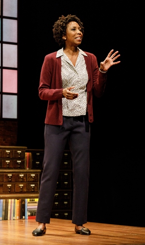 When Washington first appears onstage, she immediately claims the space as her own, the set by Tony Ferrieri consists of a staircase filled with books, a desk, and large glass windows that reflect the story's mood (the lighting variations range from fiery to evoke the furnace, to multi colored panes straight out of a church, or library). The actress moves across the stage as if she lived there, discreetly pulling out books she wants to reference, or resting in places that seem to materialize out of thin air. In terms of a one person show Feeding the Dragon, certainly has inventive directorial touches, director Maria Mileaf injects a sense of purpose into empty spaces, so that we too can "see" the staircase and banisters Washington alludes to, but as the narrative tries to find its dramatic arc the play becomes lost in itself. Washington's initial sense of wonder becomes an exhausting exercise in wondering how much longer she can stretch her enchanted castle narrative. Halfway through the show, Washington talks about her father's alcoholism, when he takes her to the bar across the street from the library, for a quick drinkshe orders her first Shirley Templethe twist seems to come out of nowhere, and as it expands into a tale of a week-long trip she took with him to see family in the South. Perhaps Washington wanted to tell a tale of finding home, but she makes it clear that for her New York was never not home, so this trip to a more idyllic location where the watermelon salesman knows everyone by name, feels disingenuous, as if the playwright was forcing herself to find things to love in order to move her audience. Washington is such a great actress that she often pulls off the moments that feel trite, after all this is her personal story and one can understand why she'd want to pay tribute to her father without turning him into the kind of larger-than-life alcoholic monster that inhabits some of the great American dramas. With a more focused approach, the tonal shifts in the show would compliment, rather than compete with each other. As it stands, Feeding the Dragon is more of an appetizer than a full meal. If Washington expands her life story into a series of plays that plunge deeper into the complex people that shaped her, perhaps we'll be in for a real banquet.