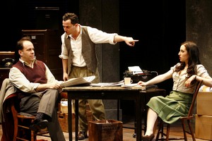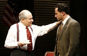 This is not something Bernard Weinraub has taken to heart in writing his play The Accomplices, which The New Group is now producing at the Acorn Theatre. In chronicling the World War II activities of Peter Bergson, a Palestinian immigrant who assumed the responsibility for informing America of the grim realities of the Holocaust, Weinraub spares no contempt for the forces within the United States government that allowed the slaughter of European Jews to go unchecked for far too long. It's a seldom-reported history lesson, to be sure, and not an unimportant one 60 (or 600) years down the line. But in assailing President Franklin Delano Roosevelt and a solid contingent from his administration, Weinraub (who was a longtime reporter at The New York Times) has neglected to construct any sort of a drama around the endless volleys of facts and numbers that comprise every other line of dialogue. In giving us no concrete sense of the human struggle behind the political one, Weinraub dilutes his message instead of enhancing it. The closest The Accomplices comes to compelling is in the isolated moments when Bergson, who rallies acclaimed actors and other celebrities to his cause, considers that his actions might themselves be making no real impact; such introspection, alas, is fleeting. By the end of the first act, relentless recriminations have so piled up around the likes of Roosevelt (Jon DeVries) and even activist leader Rabbi Stephen Wise (David Margulies) that it may seem as if you're trapped in a documentary hastily assembled from discarded WWII newsreel footage. Implicating everyone is all well and good, but it's no surefire way to ensure your show is as absorbing as it is educational. As directed with jejune flair by Ian Morgan, at any rate, this production is not. It moves cinematically around Beowulf Boritt's imposing set (which, appropriately enough, resembles a Federal courtroom for putting everyone on trial) with the help of Jeff Croiter's institutional lighting, but never pops from the stage in the occasional moments it might be capable of surviving beyond the footlights. Daniel Sauli brings a youthful likeability to Bergson, but his magnetism is more of the restless kind, perhaps appropriate for his rabble-rouser of a character, but too little on which to hang a story requiring a more forceful charisma. Sauli acquits himself best in his opening scene, in which Bergson smarms his way into the U.S. to begin pursuing his goal of rescuing as many Jews as possible from the German concentration camps.