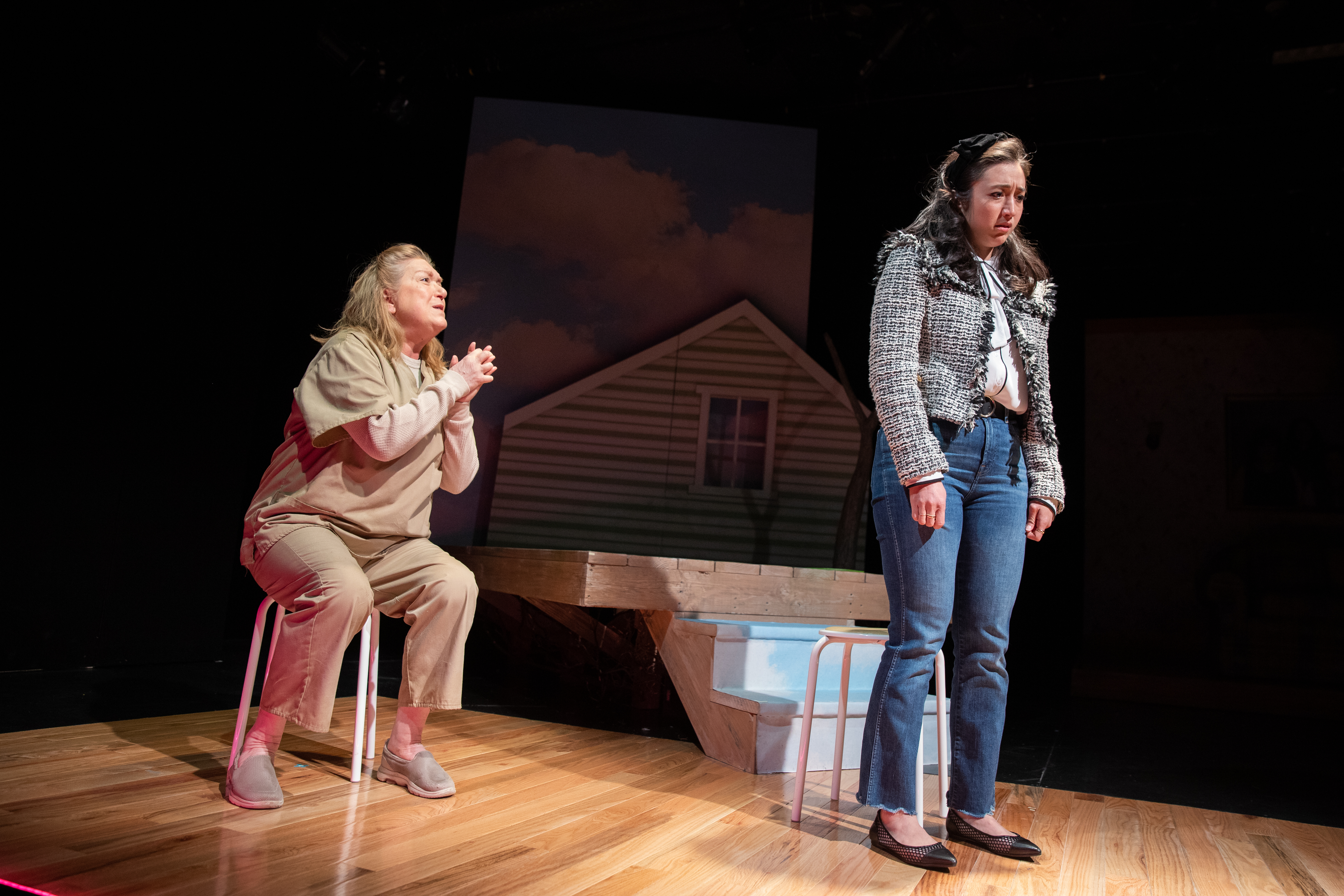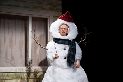 At its heart, it's a suburban sitcom: New Jersey, where we're focused on the three young-adult adopted Asian kids of the white-bread Mr. and Mrs. Whistler. Illy (Sasha Diamond) is a gifted, successful musician and a little self-conscious of how that turns her into an Asian stereotype. Mora (Shannon Tyo) keeps describing herself as a "human disaster," and she's sort of right: a self-absorbed misfit who can't hold onto a job or a partner, but a diligent caretaker of a family that needs it. And Neel (Sky Smith) is a good-natured idiot who hasn't fully formed his identity and isn't in any hurry to. I'll avoid revealing a whopper of a spoiler about these sibs, one that drew laughs and gasps and triggers much of the subsequent action. Cam (Gibson Frazier), their father, is deceased, a former incompetent Asian history professor who nevertheless is still around in the form of a snowman in the yard who divulges family history to us and acts as a sounding board for his ever-inquisitive, never-satisfied children. And Elinore (Kristine Nielsen) is a piece of work, a loving but deranged mom now in prison for murder–divulging more about that would also be a spoiler. We already knew that Kristine Nielsen can wring a laugh out of anything; here she actually has some good material to wring laughs out of. Only sometimes we're laughing too hard to hear what she's saying. To call this play undisciplined would be an understatement. There are so many strands, linking up in strange gossamer ways but careening haphazardly from theme to theme: identity; environmentalism; violence, provoked and un-; commercialization of the free open air; over-wokeism–t's all here and then some. Illy, already well off from the symphony orchestras she plays in and the fellowships she's received, has gone the way of several billionaires and purchased a piece of sky. (Is this a thing, or an invention of Izumi's?) The parents have concealed each child's native origin from them, hoping it will encourage them to see one another as equals, and the children have resolved to dig out their identities when their adoption information becomes fully available. Mora, given a hint from Elinore, sets off for Cambodia, laying over in Guangzhou, where she meets a woman (Pearl Sun) who claims to be her birth mother. Neel heads to Nebraska, for reasons too silly to repeat. Illy stays home, to plan her treehouse and gaze at her corner of the sky.