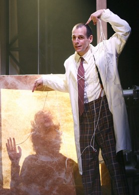 As the show unfolds, taking in writings from authors as diverse as Bathsheba Doran, Henrik Ibsen, and Chuck Mee, you begin to understand just how blurry the line is between belief in God and belief in science. The final scene, which becomes a broken-down bacchanalia of ropes, Post-It notes, and self-destruction, even suggests there's no longer any difference between the two: When taken to unnatural extremes, both can lead you to the same dangerous place. The acting ensemble is generally excellent, though the sad, desperate strength Adkins brings to his would-be prophet makes Bill the show's most plangently human presence. Of the others, only Francis disappoints, though not as her stately Saint Joan: In her earlier role as a needy, nerdy secretary with a prayer for Bill to convey to God's Jerusalem P.O. box, her attempted connection to societal disconnection comes dangerously close to overacting. Excess, in fact, is the greatest weakness of transFigures. While its set or lighting (by Jenny Sawyers and Ryan Mueller) conservatively outline a wealth of realistic and fantastical playing spaces, deBessonet's staging and especially Andrea Haenggi's choreography too often mistake busyness for energy. They have no compunction against filling the stage with multiple modern-dance writhe-a-thons, which sometimes convey the characters' "craziness" but too often detract from the true inner turmoil of people who can't understand why everyone doesn't see the world as they do. However, seen as yet another reflection of the show's primary theme, stated by one character as "the relationship between art and atrocity," it's never much more than temporarily distracting. And in the finale, when most of the cast revels about the stage - some in pain, some in joy, but all at last individuals - there's real beauty in their feeling. Another one of the show's questions asks, "Did God create the brain, or did the brain create God?", but this scene - and most of transFigures - affectingly demonstrates they're more or less the same thing.