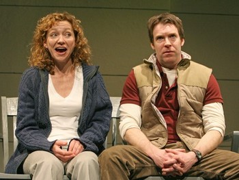 Taken together, these complications and others (Jenni Barber has a pivotal role as the student advocate ostensibly there to help Kenny, but carrying a dangerous personal agenda) make this potentially hollow outing into a satisfyingly overstuffed 100 minutes. The escalating chaos of everyone's trying to maintain normality while their expectations crumble around them, whether at that school dance for Kenny or during Grace's violent confrontation with a gardener, becomes a long-burning fuel for this mostly absorbing family portrait. But Flahive's specific words seldom land with the same concussive force of her more general ideas. Her dialogue is at once staccato and prone to overlapping, yet also derisory and vague - each person has a hundred angry thoughts waiting to be expressed. Yet during the rare times the floodgates open to let loose these torrents of resentment, there's little probing of the deeper, desperate humanity that's been held back, making even the most wrenching of revelations curiously calm affairs. So the actors and characters who must stew rather than explode come off the best, with Hutchison marvelously understated as a frustrated father figure and Cash's carefully modulated angry exterior just the right mantle for an aggrieved adolescent. Bareikis's evocation of an untethered spirit of the land is one case where outwardly directed energy works here in a performer's favor; Segal is most believable when he subdues his outward awkwardness, while Will Rogers is too outlandishly oversized to convince as a geeky but unassuming boy with an insatiable crush on Lauren. Straining somewhere in the middle is White. The queen of the big-city bon mot is somewhat at odds with the on-the-edge Grace, her inclination toward control uneasily matched to a woman always about ready to lose it. When she must be the overprotective mother, the pushing for cheeriness seems to emanate from the actress rather than her just-there character. But the more frayed and frizzy Grace's nerves, the more natural White seems - her recounting of her breakdown has all the makings of a tour de force except the carefully crafted words at the foundation. Leigh Silverman's production melds kitchen-sink realism (reflected in Allen Moyer's painstakingly detailed home set) and minimalism (for school and beyond) to sparkling effect, but can't compensate a script that doesn't make the same no-holds-barred journey. The love and anguish displayed in From Up Here is so promising that you can't help but long for the emotional extravaganzas that would no doubt result from a script that treated them as more than bullet points adorning an elaborate outline.
