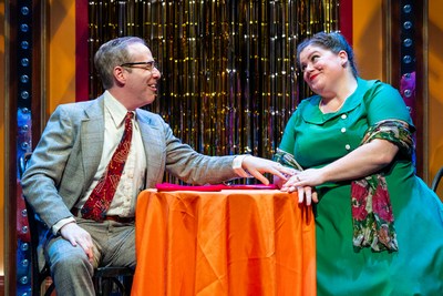 At a time when Broadway has so many of what we call jukebox musicals, here's a peppy property that could have been described with that term before it was coined as such, because its plot was about those record-playing machines you dropped coins into. Not that we actually see any of them as props in the lively, likable J2 Spotlight Musical Theater Company production (beyond a projected picture of part of a jukebox above the AMT Theater's proscenium where the location of each changing scene is named). The book by Garson Kanin (who also directed the original) was based on his own novella, involving people getting involved in the music business, so a few items in the score are diegetic songs, performed in a nightclub setting, allowing also for some spiffy dancing choreographed by Andrew Winans. The accompaniment sparkles and impresses, even though it's a sole musician: music director/pianist Miles Plant, sight unseen by us, somewhere behind the set. Robert W. Schneider, the company's artistic director and co-founder (with Jim Jimirro) directs with obvious fondness for the genre and characters, and a stylish sense of fun. The smallish stage is set up attractively and cleanly with three openings for entrances and exits, with hanging gold strips, each framed by rows of light bulbs (set design: Matthew Imhoff). Tables and chairs are brought on and off for scenes, but to save time or make space for dancing, pieces of furniture (and in one case, people) distractingly appear or disappear at odd times. Ian Lowe plays Hubie, a hapless guy who thinks he could be happy if only he can find the right scheme and money to get it going. The actor certainly seems to be borrowing from the collection of schtick of the broadly comic actor who originated the role, Phil Silvers: an agog persona, slow-mo turns to stare at others with his mouth open while awaiting approval or forgiveness, bumbling or sashaying movements, fast-talking his way through excuses. On their tenth anniversary, Hubie's patience-tested, testy wife Kay (the vibrant-voiced, resourceful Rebecca Spigelman) begs him to be practical and "Take a Job." Much of the production's expert comedy comes from the trio of unsavory colleagues, with polished line readings, economy of movement, and laughable facial reactions by Eric Michael Gillett, Richard Rowan, and John Leone. Talented singer Caitlin Belcik portrays the talented singer who is finally found: a waitress named Tilda, overheard humming at work. A star is born. But trouble and/or true love may be brewing when an established figure in the music biz enters the picture and their instant mutual attraction sets off "Fireworks." Although his solo singing wasn't always secure or strong enough in sections of some songs on opening night, Tyler Okunski is charismatic and disarming as this man, John Henry Wheeler. (A not-so-impressed Hubie wonders why he has to have three names). The lighthearted show generally stays comfortably in its middle lane, between the extremes of overt cartoonishness and realism. But there are times it veers into those other territories and, fortunately, it's usually worth the detour. Some don't land ideally. Caleb Funk, listed as "Character Man," shows up as numerous odd fellows, some more effective than others, but often scoring big laughs with little moments. And then there's the climactic rueful turnabout for Hubie. The switch in tone to self-pitying, self-analyzing material that Styne, Comden and Green gave him near the end ("All of My Life") seems to be cut from such a different cloth, and wanting us to suddenly take him seriously and truly care is a big ask. But kudos to Mr. Lowe and director Schneider for going for it, making it work as well as it does. Mallory Nolting and Kaylee Verble round out the cast, playing multiple roles. With two more Tuesday matinees just added for the run, J2 Spotlight also widens its spotlight on Styne, Comden, and Green by presenting a batch of their other songs in a cabaret program on April 23, at the same West 45th Street venue. There are Post-show talks at most performances.