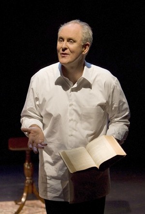 John Lithgow imbues this feeling into every moment of Stories by Heart, his one-man excursion into elocution that's directed by Jack O'Brien and is playing Sunday and Monday nights through May 25 at Lincoln Center's Mitzi E. Newhouse Theater (which is housing the musical Happiness the rest of the week). Lithgow may be a two-time Tony Award winner and a celebrated film and television actor, but at his core he's a loving father and tale turner determined to pass on the formative (short) literature of his upbringing using the resonant voice and malleable personality that have always uniquely characterized him on stage and screen. Lithgow's current engagement is functionally identical to the one he presented in the same theater last year: a brief yet endlessly whimsical journey through the cherished storybook that saw him through his own formative years, mixed with recollections about the life and family it still summons for him. In fact, he's still taking his previous trip through P.G. Wodehouse's "Uncle Fred Flits By" on April 27 and May 4, 11, and 18. But on April 26 and May 3, 10, 17, and 24, he's doing a new (old) piece he's unearthed, Ring Lardner's 1925 "Haircut." (On May 25, Lithgow is performing both together.) "Haircut," recounted by a barber in the time it takes him to shave and trim a new customer, is as dark, unsettling, and American as the Wodehouse was meringue-light and British. Lardner's strangely suspenseful intersection of a practical joker, a beautiful woman, a knowing doctor, and a mentally challenged young man is a piercing condemnation of the violent indifference of turn-of-the-20th-century small-town America, commenting on how callous acts become, with time, folklore worthy of being laughed at and lathered off. It takes myriad twists, turns, and diversions, and never lets Whitey, Lithgow, or you off the hook until its classic, disquieting final line. As such, "Haircut" does not allow Lithgow the same effortless entrée into entertainment that "Uncle Fred Flits By" does; its pleasures are subtler and more cerebral. O'Brien has meticulously helped Lithgow adopt the mien of a period barber: Watch how he painstakingly prepares the straight razor or suds, for example. Or how Whitey occasionally so immerses himself in his own yarn that he forgets he's in the middle of a job. Or (especially), how Lithgow introduces the vaguest hints of voices and identifying tics into his character - perfect for playing a man who's not at all skilled at impersonating others. This latest chapter of Stories by Heart is unquestionably enjoyable, but it's targeted more to adults than to the families that can safely delight in the timeless comedy of "Uncle Fred Flits By." (Even the new curtain-raising palate cleanser is twisted: The blithe ballad "Eggs and Marrow-Bones" recounts how a woman blinds and then attempts to drown her husband.) It's also rather less touching than its counterpart beyond the boundaries of Lardner, its nostalgia-tinged focus more on Lithgow's Midwest upbringing and personal background than on the parents who bestowed in him the joy of acting. Regardless, it demonstrates depths and colors of talent that Lithgow, despite the many fine performances he's given over the years, rarely gets to show. And because of the firmly literary quality of the show and the invention Lithgow and O'Brien both display in bringing it to life, it - like its predecessor - is one of the rare good-for-you shows that isn't also mustily educational. Like any good parent, Lithgow knows how to put you at ease and let the story itself do all the work. It's probably not possible to know how many more full-length recitations Lithgow can juggle in his head, but here's hoping he won't stop until he's got enough to populate an entire theatrical bookshelf.