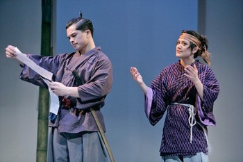 Well, almost. Dedication to one's kin before one's own urges isn't enough to place Peter Mills and Cara Reichel's new show at the Hudson Guild Theatre in a timeless pantheon of entertainment. No Shogun is this - James Clavell's erotically charged epic is too sweeping in scope; even Rodgers and Hammerstein's modernist spin (for 1958) on similar themes, Flower Drum Song, goes further with its concept of generational give-and-take. But in the grand Broadway-styled tradition, a half-dozen stage-filling swordfights (the blood-pumping work of Jacob Grigolia-Rosenbaum) and at least as many rapturous melodies, from the writers who should be known as Off-Broadway's premiere composing couple, don't hurt. They're also not enough to elevate this unprepossessing look at filial responsibility in feudal Japan beyond the level of a promising idea. Whenever another song begins about the fleeting nature of life or the flitting vagaries of chance, it's hard not to realize exactly what you're missing. That would be the grander significance of the struggle of the show's central characters. Though equal doses Kurosawa and Pacific Overtures in look and manner, Honor owes a greater debt to William Shakespeare's urban-invades-pastoral lark As You Like It - one that's not repaid by addressing the themes that make that outwardly frivolous comedy so deceptively insightful. The basic story tracks closely, with minor alterations: A young woman of the court, Hana (Diane Veronica Phelan), flees to the country after her daimyo father Takehiro (Ming Lee) is overthrown by the dastardly Katsunori (David Shih), taking with her only her friend Kiku (Ali Ewoldt) and comic protector Nobuyuki (Steven Eng). A young would-be samurai named Yoshiro (Vincent Rodriguez III) is banished after seeking revenge for his own father's murder, and winds up in the same forest as Hana, whom he's secretly loved since she awarded him for bravery. Except, of course, she's disguised herself as a man for protection. Children must learn when to obey their parents' wishes and when not to. The impetuous must learn patience, primarily from the philosophical sword instructor Makoto (Alan Ariano), whose method starts and ends with improvisational poetry. And both the throne folk and the simple folk they meet in the forest must learn the single, inalterable truth about war: people die. The structure and order of the various samurai and daimyos, so essential to the atmosphere, induces a direct, more serious political bent seemingly more suited to an adaptation of Hamlet. And the last third of the show, consumed with battle planning and revenge, spirals into an even darker direction that suggests Mills and Reichel had more on their minds than the cross-dressing, misdirection, and melodrama of Shakespeare's original. Yet their innate musical-comedy inclinations, realized much more fully in previous Prospect shows like The Pursuit of Persephone and Iron Curtain, undermine this darker interpretation. The country lovers mixed up in Hana's mess, here called Kuro (Romney Piamonte) and Mitsuko (Jaygee Macapugay), are a mugging pair of comic secondaries more akin to Oklahoma!'s Ado Annie and Will Parker than their more complex Shakespearean counterparts. While Mills and Reichel's music (as gracefully orchestrated by Erika Ito for strings and woodwinds) summons the proper wistful ambience, Mills's intricate lyrics convey an emotional knowingness few characters display in dialogue, while Reichel's simple-but-elegant staging allows too many actors' takes, grunts, and grimaces to mine for laughs rather than truth. Rodriguez, a soulful young performer in his New York debut, is especially prone to this, undercutting the appealing aura of wounded innocence (and impressive voice) he otherwise brings to Yoshiro. Eng plays even more broadly into Nobuyuki's many jokes, his "who, me?" grins telegraphing (and spoiling) far too many laughs. Phelan is wonderfully conflicted as Hana, torn between obligations to her mother (a radiant but underused Christine Toy Johnson) and herself, but less convincing as the man who schools Yoshiro in the ways of poetic love. Shih and Lee make a superb yin-and-yang pair for the daimyoship in dispute. It's Ariano, however, who walks away with the most scenes and songs. He grants Makoto a stunning serenity that codifies the work's treatment of duty and tradition better than most of the writing or design (including Sidney Shannon's exquisitely appointed costumes). Ariano's understatement lets you focus on the words and the feelings behind them - a dual-edged sword, as the missing musings of theatre, sexuality, and humanity that fuel As You Like It become even more apparent. Lacking so many of that play's gender- and mind-bending confusions, this musical can't sustain itself on the pleasant little story that remains. Given Japan's own history of kabuki, which has a direct corollary in the men-playing-women conceit of Shakespeare's theatre that's so crucial to As You Like It, the comparative shallowness of Honor is the evening's only real surprise.