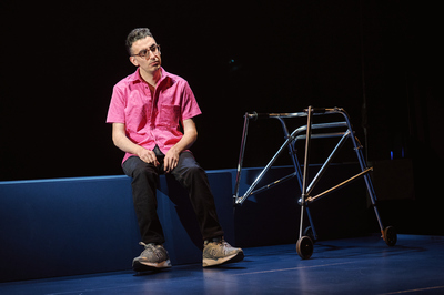 Accompanying that rising platform and spangly jacket: a walker. Haddad is young, gay and afflicted–he might take umbrage at the word–with cerebral palsy. The tale he's about to tell, stretching back six or seven years, is a young-love story familiar in many respects, but thrown into new territory by his condition. We've had other plays about romantic relationships with the disabled, notably Martyna Majok's Cost of Living, but they've rarely been this intimate, or produced this many giggles. That's because Haddad is such an engaging raconteur. His voice is light and expressive, his body language eloquent. After some preliminaries–"Please, I'm begging you, if you need to go to the bathroom, go! The last thing I want to do is keep people from going to the bathroom! I may even have to pee before this is over!"–the meaning of the title becomes evident pretty quickly. It's 2018 and Haddad, arriving at an artist retreat to work on another autobiographical solo show, instantly meets "the hottest guy at this residency." He lusts after him; everyone does, it seems. But Haddad, resourcefully, manages a meet-cute with the guy (whose name we never learn, nor his occupation, though whatever it is takes him out of town a lot), chats him up, starts texting him, and arranges a beach date where the guy, yes, holds him in the water. And there Haddad experiences a safeness, an intimacy, a kindness, the likes of which he's never known. We feel we're in the lake with him. The guy sounds too good to be true, and maybe he is, but maybe not, no spoilers here. More dates follow, and sex, and it gets pretty graphic–"Slapping his ass as he thrusts inside me," a lot of that; if such stuff makes you uncomfortable, stay home. The emphasis, though, is on Haddad's inner being, his surprise, incredulity, and ultimate acceptance of being an actual object of desire, something he wasn't sure he'd ever achieve. We find out plenty about him. His parents and grandmother support him fully, and don't get squeamish at sex talk. He's a seasoned New Yorker, and some East Village landmarks–Veselka, The Boiler Room, The Bean–get shout-outs, along with some amusing local observations: "You'd think the High Line is gorgeous from all vantage points, but, like..." It's a small show, one that might have been more at home in Playwrights Horizons' smaller theater upstairs, and it doesn't, to put it kindly, employ a lot of resources of the theater; like many one-person shows, it's more stand-up than play. The set, by dots, is barely noticeable, until Christmas arrives, and we at least get some holiday lights and snow. Beth Goldenberg's costumes, though Haddad praises them to the skies, don't tell us much about who he is. Cha See's lighting is mostly a glowing blue, changing occasionally for mood. Danny Sharon directs, and while he keeps the 70 minutes moving and lets the punchlines reverberate, one suspects Haddad has the upper hand in the staging. One other note: There are supertitles, which throw the timing off, as the readers get to the jokes quicker. Some performances will have ASL. But Hold Me in the Water is romantic, touching and funny, and as the commitment-level conflicts in the relationship arise, we feel genuine concern. Near the end, Haddad poses to the audience some questions that, in their pointedness and provocativeness, amount to something of a coup de théâtre. Essentially, in many permutations, he asks: Could you love a disabled person? And for many the answer will be, yes, I could, if they were as cute and charming as Ryan J. Haddad. That's admittedly a tall order. Hold Me in the Water Through May 4, 2025 Playwrights Horizons Mainstage Theater, 416 West 42nd Street Tickets online and current performance schedule: PlaywrightsHorizons.org