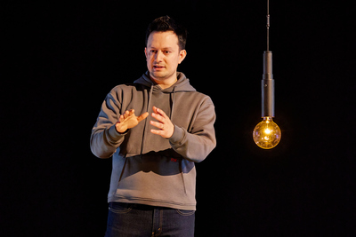 When Kayne, who wrote and stars in the show, introduces his family, he shows a photo of his wife Carrie and two children, Truman and Willa. He quickly qualifies his familial identification by stating that he's "not exactly" telling the truth. He also has another son, Fisher, who is Truman's identical twin brother. Fisher, Kayne explains, "died when he was 34 days old and that's what this show is about." Kayne proceeds to describe in harrowing details the circumstances around Fisher's death, and the debilitating grief that followed and which continues to linger. Yet, he points out the moments of absurdity and the elements of dark humor along the way, particularly in an experience with the all too eager to please administrators of the funeral home. (Aaron Rhyne designed the clever and helpful projections that back up Kayne's humorous claims throughout.) There also is a joke about an infant's onesie that is very amusing, but it received a few "too-soon?" gasps among the audience. Additionally, there are clever tangents in the form of classroom whiteboard lectures to prove his adage about the pitfalls of thinking things are just one way. Drolly, Kayne points to math, linguistics, and quantum physics for evidence. As a raconteur, Kayne is completely winning. The structure and execution are reminiscent of Mike Birbiglia, who has a similar style of circling around the main story and weaving through narrative diversions to link personal anecdotes with commonly shared experiences. If Kayne doesn't yet have the trenchant wit and slyly offhand delivery of Birbiglia, I still look forward to his monologues in the future. Josh Sharp directs, and while the focus is on the storytelling and engagement with the audience, there is a good deal of theatricality, especially in the last several minutes of the show. Aided by Brett Banakis's simple set design and Cha See's dazzling lighting, the production offers a moving and comforting vision of the departed among us. Over the past few years, Audible has produced some excellent works, and they have become an invaluable part of the Off-Broadway landscape. Although they specialize in presenting plays that will appeal primarily to listeners of audiobooks and podcasts, as Sorry for Your Loss demonstrates, their shows are well worth seeing. As Kayne reminds us, we mustn't rely on preconceived notions.