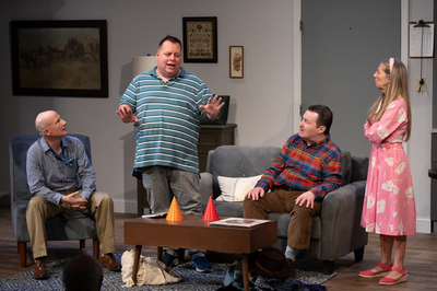 The Actors arrives here following successful and highly praised runs in Utah, Michigan, and Florida. If this list of previous venues makes you wonder how New York audiences will take to it, let me expand my already-expanded adage and say, never judge a production by the locale of its prior engagements. The premise of the play sounds a bit nutso. A middle-aged zhlub of a man named Ronnie (played by Ronnie Larsen himself) is unable to get on with his life following the death of both his parents. Therapy has not been of any help, so he has come up with a solution. He will hire actors to report to his apartment a few times a week to interact with him the way he recalls his parents did when he was a child. Perhaps that will lift him out of his funk. And so he does. And so it goes, as he enlists Jean and Clarence (played by a pair of talented actors, Jeni Hacker and Allen Lewis Rickman), who agree for a negotiated fee to take on the roles of Ronnie's mom and dad. Jean, in particular, is skeptical at first, but in the end a job's a job, and so why not? And, indeed, things do seem to be working out for a while. Until Jean and Clarence start to get a little bit too caught up in the storyline and improvise well beyond the narrative Ronnie has devised. ("They're wonderful actors," he says of them at one point, "but they can't take direction.") Soon, Ronnie's life is no longer his own. Neither, it seems, is his apartment. But just as things are about to explode into an absurdist circus, who should show up at the door but Ronnie's brother Jay (Jason Guy, another polished actor), who lives across the country and whom he hasn't seen since their father died four years earlier. Yet Jay is no deus ex machina, there to save the day (and the play) from going over the cliff. There is more than a degree of sibling rivalry and old habits that they fall into, along with some family secrets to be revealed before the plot resolves. Throughout, there are plenty of twists to keep the story flying, but as a playwright, Larsen has a way of mixing outlandish situations with unfeigned moments that ring true, while the steady hand of director Stuart Meltzer keeps everything just on this side of feasible. Through this collaboration, the production comes together in a way that brings to mind one of Neil Simon's funny/heartfelt plays that combine pieces of autobiography with skilled playwriting. And that makes The Actors something that Utahn and New York audiences alike can appreciate.