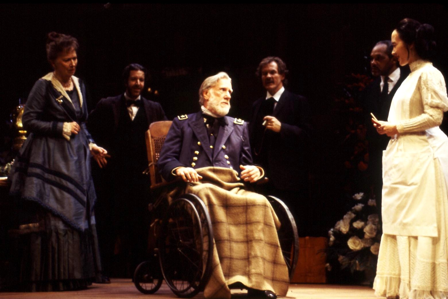 It's difficult to know just where to begin when discussing a play like John Guare's A Few Stout Individuals, which just opened at the Signature Theatre Company's Peter Norton Space. Funny? Captivating? One of the best plays to open on or off Broadway so far in 2002? All work, yet all are inadequate in describing this tremendously entertaining play. Guare has fashioned a unique work based upon a major historical figure that is as unafraid of reimagining history as it is of respecting and criticizing it. The Ulysses S. Grant of A Few Stout Individuals remains the distinguished Civil War general and the less distinguished President, but has been given a strong degree of imagination and fancy, one who lives in the past and present simultaneously. Grant (Donald Moffat), suffering from a number of maladies and facing financial destitution by the time the play starts in 1885, is only able to unlock the secrets of his past when reliving the past. The memories that could fill his memoirs and provide security for his family are trapped behind barricades he can reveal to almost no one in the real world. Slowly, the remembered (or perhaps imagined?) characters flood his everyday world, granting him the threads of life and consciousness that his doting wife (Polly Holliday) and excited publisher Samuel Clemens (William Sadler) need. For Guare and his director Michael Grief, this represents what is perhaps the play's most valuable asset. They seamlessly blend the two sets of characters into one fully integrated collage, with a great deal of help from the show's thirteen highly talented performers. The most striking characterizations come from Holliday and Sadler, who negotiate their difficult roles without ever devolving into caricature, but Moffat's Grant is a strong center, anchoring all the other performances. From Cheryl Evans's unexpected opera diva to Charles Brown's resentful servant, there's simply not a weak one to be found.