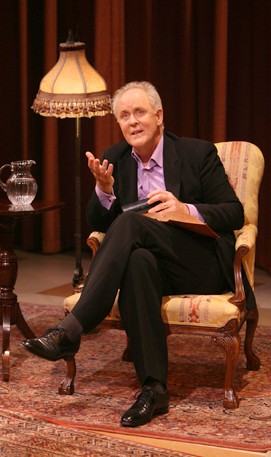 Not that Stories by Heart, which John Lithgow is performing Sunday and Monday nights at the Mitzi E. Newhouse Theater, is Grand Culture on par with the opera, ballet, and drama usually filling the institution's bills. This 90-minute solo outing is so homespun that were it not for the two-time Tony-winning actor at its center, it would be all but impossible to identify as theatre at all. Yet the evening's two lengthy recitations are more than just parlor tricks of prodigious memorization. As lovingly directed by Jack O'Brien, they become vivid evocations of times, places, and ideals long vanished, of the skill of simple storytelling so often sublimated today to spectacle and artifice. And as linked by the supple waves of Lithgow's mock-haughty, mellifluous voice and his interjections about their relationship to his own personal history, these featherweight writings even become the engaging memoirs of an always-theatrical family. With "The Deacon's Masterpiece" (or "The Wonderful One-Hoss Shay"), Lithgow relates Oliver Wendell Holmes's dashingly lyrical look at a perfectly constructed carriage that fell apart on the 100th anniversary of its construction. While his performance is certainly a lesson in pacing, phrasing, and communicating antiquated vocabulary (when did you last use the words "thoroughbrace" and "whippletree" in conversation?), it's also a lovely hug of a tribute to his grandmother, who was brought up to learn and retain such poems, and introduced him to this one. P.G. Wodehouse's 1935 "Uncle Fred Flits By" is even more personal, as it served as both cherished bedtime reading for Lithgow when he was young and as vital home therapy decades later when his elderly father was stalling in recovering from an operation. Lithgow credits Wodehouse's tale of dandy deception with turning around his father's health extending his life - no small achievement for an elegant piece of piffle about the loony adventures of two-bit con artist Frederick Twistleton and his tag-along nephew Pongo. For both Lithgow and his father, who was himself an accomplished actor and producer, Uncle Fred's delirious deceptions tie into deeper questions of what any art means to those who love it, and why pretending to be someone else can sometimes reveal the soul instead of hiding it. Enjoyable as "Uncle Fred" is, especially as ornamented by Lithgow's tongue-clickingly precise diction and one-man tableaux of the easily confusable upper-crust characters, the actor's descriptions of his father's triumphs and tragedies on and offstage are every bit as moving and informative as those that preceded him by decades. This is an enormous part of what makes this such a touching example of non-theatre theatre. The twists, turns, and sly subversions that wiggle into this beguiling fireside chat of a play (complete with easy chair, end table, and lamp) are equivalent with some of the better non-musical offerings this season. (Including the show currently sharing the Newhouse, Paul Rudnick's The New Century, which - it must be said - is quite a bit funnier but less endearing.) But it's the strength of the message that what we read or see can never compare to what we create ourselves that lets Stories by Heart keep your heart firmly in its grip from start to finish.