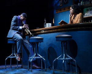 Ms. Morisseau, whose recent Skeleton Crew was a stunning exposé about the teetering lives of black auto plant workers, has proven herself to be a playwright to be reckoned with. Paradise Blue is a more ambitious work that employs a degree of hyperrealism to capture the essence of life for both the African American community and for the individuals who are both protected and trapped within the narrowing space over which they have marginal control. The play is set in a jazz club known as the Paradise. It is one of many such clubs competing for customers in the Detroit neighborhood known as Black Bottom. The owner is a young man, a trumpet player named Blue (J. Alphonse Nicholson, a pacing tiger on a hair trigger) who is considering selling the place to the city and using the money to escape Detroit and the demons that are eating him alive. In a time of both legal and de facto segregation, this is a rare area of black-owned businesses, and the idea of Blue "selling out" is one of the major themes explored here. Blue is a difficult man to fathom, a mix of equal parts fear and rage. He has inherited the club and his personality from his monster of a father, and he is struggling to make a successful go of it while striving to subdue his barely contained emotions. The tough front he offers to the world is on the brink of collapse, affecting his business and his relationships. When the play opens, we learn he has lost his bassist, and he is putting his drummer P-Sam (a scrappy Francois Battiste) on hiatus. He plans to make do with a smaller combo, with himself soloing on trumpet, accompanied by his regular piano player Corn (Keith Randolph Smith), the designated peacemaker of the group. He also has plans for his girlfriend Pumpkin (Kristolyn Lloyd), the quiet young woman who cooks, cleans, and waitresses at the club, to be the combo's singer, even though we are told repeatedly that she has no talent in that area. The tenuous equilibrium Blue has managed to maintain is pushed to the brink with the appearance of a stranger by the name of Silver (Simone Missick), who comes sashaying into the club one day as if she had invented the word "sashay." An alluring and confident widow, stylishly dressed in black and flashing a large wad of money, Silver is sure to remind you of Shug Avery, the smart, tough, and self-assured woman who becomes Celie's friend, lover, and mentor in "The Color Purple." There are some major differences, however, as Silver rents out a spare bedroom upstairs and proceeds to insert herself into everyone's life. She soon becomes the talk of Black Bottom, with whispers suggesting she is a Voodoo witch or a "black widow spider" who voraciously devours men. Indeed, she may or may not have killed her husband with the gun she keeps at hand. As the play progresses, especially in its second half, the tone of hardscrabble realism takes on a more mythic air. Both P-Sam, who has won a large pot of money from playing the numbers, and Silver, who has quite a bit of cash of her own, are interested in buying out Blue before he capitulates to the city's offer. In what might be the most compelling lines in the play, P-Sam lays out his argument: "This ain't just your club. You might be the one to own it, but you ain't the one to make it. We all make this Paradise." His world may be small, but at least it is his. "I ain't goin' back to playin' background for them big bands. White man say, wear this, smile like this, sit like this, take your meal after these folk. I ain't doin' it!" Meanwhile, the soft-spoken Pumpkin who feels sorry for the increasingly abusive Blue but who does not want to leave Black Bottom, has been watching every move. She is gradually discovering that she has a reserve of strength within her she had no idea was there. When she finds her voice, when the seed of empowerment Silver has planted in her starts to sprout, everyone had best stay out of her way. Paradise Blue could profit from another round of revision. We would do well to know more about Blue's background and the dynamics of his relationship with Pumpkin to better understand what drives both of them. A side story in which Silver takes up with the tender-hearted Corn and begins to imagine the possibility of a different sort of life than the one she has known provides for some truly touching "Porgy and Bess" moments. But these throw the play off balance as events plunge headlong to their inevitable sorry end. Despite the occasional rickety bits, however, it is quite possible to see Dominique Morisseau as the heir apparent to August Wilson, with Detroit being the center of her work just as Pittsburgh was for Wilson's ten-play cycle about the African American experience throughout the twentieth century. The fact that this production is being directed by Ruben Santiago-Hudson, a masterful interpreter of Wilson's works (among them, award-winning revivals of The Piano Lesson and Jitney), certainly affects how it is being staged and performed. Yet Ms. Morisseau's voice and style and characterizations are decidedly her own, and there is a lot going on here that makes us eager to see more of what this gifted playwright has in store.