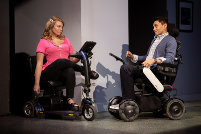 Set in Schenectady, New York, the play begins in a hospital (Ellis, which would be recognizable to Schenectadians, like this former denizen) parking lot and immediately introduces the future lovers. (Brett Banakis and Edward T. Morris designed the adaptable and notably accessible sets with laudatory lighting by Reza Behjat. ConsultAbility serves as the accessibility and disability consultant.) Alfonso (Danny J. Gomez), a nerdy and sincere data scientist who uses a motorized wheelchair, is waiting for his STAR Bus, and Lucy (Madison Ferris), an outspoken twenty-something woman who uses a motorized scooter, is expecting her sister. Both use speech-to-text speaking devices, so their dialogue is automated and monotone. (Thomas Schall designed the very effective sound.) Lucy is flirtatious, and after sharing their favorite pre-set lines on their audio devices and commiserating on awkward medical examinations, the two hit it off and agree to go on a date. Naturally, the course of true love never did run smooth, and the young couple must negotiate familial conflicts and other obstacles. Lucy lives at home with her exceedingly empathetic sister Jackie (Lily Mae Harrington), her religious and easily agitated mother Connie (Kyra Sedgwick), and Jackie's ne'er-do-well fiancé Moose (Brian Furey Morabito). Connie, who is also overprotective, insists on meeting Alfonso before giving her blessing to the relationship and escorts her daughter on the first date. A dinner invitation proves disastrous when Connie practically come to blows with Alfonso's cosmopolitan, career-driven, and overbearing mother Elena (Florencia Lozano). The play is at its best when it probes the intersections of class and disability. Similar to Amy Herzog's profoundly moving Mary Jane, currently playing on Broadway, All of Me shows the financial impediments confronting people with disabilities. However, when Lucy and Moose hatch a plan to address their economic circumstances, the play relies on some twists and coincidences that strain credulity. Still, the performances under Ashley Brooke Monroe's direction are quite strong and pull the scenes back from the melodramatic edge. Sedgwick is quite good as a woman trying to do the best for her family while her own body works against her. Harrington is quite sympathetic as Jackie, especially as her own sister and partner almost ruin her wedding day. (Sarah LeFeber designed the costumes and has given Jackie a lovely wedding dress.) Morabito and Lozano provide good support and are excellent foils in their roles. Ferris, who appeared on Broadway in The Glass Menagerie with Sally Field and Joe Mantello, is both deeply affecting and riotous. Her character was diagnosed as a teenager with muscular dystrophy, which has affected her speech, and she has just recently begun using the text-to-speech device. A former jazz singer with a bright musical future, Lucy masks her bitterness and insecurity with sarcasm, wry humor, and occasional nastiness. What the audio delivery lacks in vocal inflection and intonation, Ferris makes up for in flippant gestures and exaggerated facial expressions. She is, in short, captivating. As her romantic partner, Gomez is charming and irresistible. Alfonso was paralyzed as a baby, and he is much more comfortable and confident with his disability. Lucy is resentful of the pitying gawkers she comes across daily and explains why she was embarrassed during an experience at Starbucks. "Four different strangers stopped by our table and asked us if we needed help. Four." In contrast, Alfonso did not find it all personally demeaning. He matter-of-factly explains, "I actually think it's mortifying for the strangers." Alfonso is a successful scientist, but under Lucy's forthright sexual advances, he is lovably timorous, and Gomez strikes the balance between self-assurance and timidity perfectly. While not as utterly heartbreaking as Mary Jane nor as exquisitely crafted as Cost of Living, Martyna Majok's Pulitzer-Prize winning play that also explores the fraught relations between people with and without disabilities, All of Me is unabashedly entertaining and makes a significant contribution to diversifying the theatre.