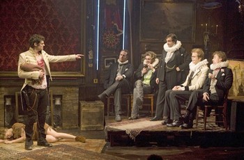 These issues and others, however, are never marginalized within the driving groove of Timbers's songs, which define the proceedings' silly-soulful character in their percussive piano-bass-guitar strains and wrenchingly confessional lyrics. No, it's the history, not the score, that's the raison d'ĂȘtre, so the songs directly serve the action even when they don't seem to. The gimmick never gets old because it's constantly changing: The restless seething of the earlier scenes becomes almost contemplative later on and, in a particularly unsettling moment, gives way to ear-splitting silence. But everything is superbly balanced. The cast, led by an electric Walker as the broodingly inaccessible sex-symbol Jackson and packed with quirky comic actors, has more personality than any other in town. The band (led by Justin Levine), the lights (and Justin Townsend), and the costumes (Emily Rebholz) beautifully complement the presiding exhibitionist aesthetic. And Donyale Werle's set is remarkable, a frontier tavern that giddily recalls Spring Awakening's time-warp schoolhouse (complete with neon strips) - except with more antlers. This production's relative opulence does call into question something else about the show: its full title. Bloody Bloody Andrew Jackson: The Concert Version reads the front of the program, but except for the handheld microphones, this is a fully-staged and -realized production. Could the subtitle be yet another goof on Jackson, one final irony crowning a show full of them that's about a president whom they ruled and haunted? Perhaps. Regardless, Timbers and Friedman more than justify their portrayal of Jackson as his century's individualist rock star, and have given him enough pain to wail about - and cause - to make him equally at home in 2009.