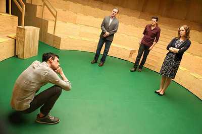 For even though Bartlett and his director, James Macdonald, may not have crafted a stage work about literal cockfighting (at least in the non-pornographic sense), they've appropriated some crucial elements of the practice to demonstrate that people are not as far removed from their basest instincts as they might like to think. The set (designed by Miriam Buether) places the audience on plywood bleachers, on all four sides of a round arena so small, the most efficient way for performers to move around it (and each other) is to walk in circles. So when conflicts arise, which they do roughly every 30 seconds or so, the tension is palpable: You know, as intimately and totally as they do, that there's no escape, and that someone is destined to be ejected from the ring maimed at best and dead at worst. And why not? These folks have plenty to be enraged about. John (Cory Michael Smith) has been in a lengthy relationship with another young-ish English man (known only as M, and played by Jason Butler Harner), but during a tiff runs off and sleeps with a woman (referred to as W, and played by Amanda Quaid), with whom he then develops feelings for. Or at least he thinks. He's only ever been interested in, and been with, males, so the experience is new to him, but she offers John a tenderness and understanding he can't get from his official boyfriend. He tries to juggle both for a while, but eventually circumstances force him to choose between the one who arouses him and the one who emboldens him, so someone is guaranteed to get hurt. Bartlett does not extend his plot especially far beyond thisalthough John's father (Cotter Smith) does appear after a while to officiate the final confrontation between his son's warring loversbut he doesn't need to. His exploration of the feelings this conflict engenders on all sides is shockingly rich: We see how John and M progress through sections of their relationship alternately erotic and heartbreaking, watch as John develops an appreciation of the female anatomy, and witness the intimate discussions on both sides that chart the desolation and despair any choice will inflict. Bartlett shines light into every corner of this struggle, often with a surprising angle toward humor that makes the four-way pain that fuels the play more bearable than it would otherwise have the slightest chance of being. But the play's meaning is just as surely found in its silences, which Macdonald and his actors (all of whom are exquisite) conduct with the assuredness of operatic maestros. A single awkward touch between Harner and Smith illuminates the complexities of their relationship better than pages of dialogue could. (The show is lean, running barely 90 minutes, but never feels like it.) The slowly collapsing concentric circles in which John and W move in the build-up to their initial sexual encounter is pure modern romance at its rawest and most uncertain. Even the unassuming way John's father clasps his hands in resignation, when the dinner party at which his son is supposed to finally choose his partner, conveys a powerlessness and anguish that are absolutely elemental. That the presentation is constructed to allow nothing to interfere with the drama, without a suggestive change of Buether's costumes or even a single set piece, only amplifies the evening's searing impact. All this conspires to make a literal edge-of-your seat enterprise, in which practically everything, from the grandest joke to the tiniest bit of staging (Smith's crouching at one point is as harrowing as anything you're likely to see this season), effortlessly works. Were I to insist on quibbling, I might take issue with a bit of Bartlett's futzing with time in the first several scenes; the bidirectional leapfrogging of the days and weeks in which M and W get to better know John and, by extension, each other, makes it difficult at first to know what is happening and when. But this is ultimately little more than a minor inconvenience. To the (beautifully limited) extent that Bartlett's play makes a major misstep, the only potential candidate is the title. The problem isn't so much that it's provocative as that it is needlessly so: Even given its publicity image, it's not intended to conjure up images of male chickens, and the slang definition itself receives but the most passing of references. Like Stephen Adly Guirgis's The Motherfucker with the Hat, which premiered on Broadway last year, it's selling its imagined salaciousness ahead of its content. It doesn't need to. Cock's examination of the aching human soul and the horrific things we do to ourselves and each other in search of our uncertain ideals of love is more engaging and engrossing than any mere sexual escapade could ever be.
