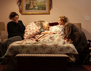 There is an unwieldy amount of information to take in during the play's running time of more than two-and-a-half hours, and even with the grand treasure of an actress, Lois Smith, in the title role, things nearly collapse under the weight of it all. As the Emperor Joseph famously says to Mozart in Amadeus, there are too many notes. Part of the problem lies in the fact that there are two storylines here, either of which could support a play on its own. For one of them, it feels almost as though the audience is expected to be taking notes about how hospice care works, the use of medications to ease pain and anxiety for the dying, the psychological impact on the caregivers, and so forth. All of this information is presented with great specificity by Bonnie (Mia Katigbak), the straightforward hospice nurse in charge of Mary Frances' case, and by Michael (Brian Miskell), the overly-eager-to-help social worker. This is docudrama to the nth degree. Then there is the other part of the plot that deals with Mary Frances' hapless middle-aged children, whose story unfolds more like that of a convoluted soap opera. The siblings barely get along in the best of circumstances. And this is far from the best of circumstances. The enmity is particularly palpable between Fanny (Johanna Day), a volatile and unreliable drug addict, and her sister Alice (J. Smith-Cameron). Alice, who lives in New York City, reluctantly takes over their mother's care at their family home in Connecticut after she finds Fanny half asleep on the sofa and Mary Frances' oxygen tank turned off. The two sisters barely can stand to be in the same room with each other, and the air is filled with their accusations, screaming, and threats every time they come into contact. There also is a third sibling in the picture, a brother, Eddie (Paul Lazar), who is all but useless. His contribution is to pop in from time to time, spend a couple of hours sitting with their mother, and then take off without lifting a finger to actually help with anything. Also on the scene are Alice's daughters, the married Rosie (Natalie Gold) who always arrives with her baby in tow, and Helen (Heather Burns), an OCD-suffering television actress who has been helping to support her mother for the past decade because Alice has been unable to make ends meet in her career of casting horoscopes. Finally, there is Clara (Melle Powers) the home health care aide whom Mary Frances hires late in the proceedings when she wants to be left to die in peace in the hands of professionals. If you can manage to tune out the constant uproar and pay attention to Mary Frances, you will find that Lois Smith gives us a richly developed character who remains clear-headed and in charge of things until the very end. She will not let go until she is sure the bills are paid, that everyone understands she is to be allowed to die with no further medical interference beyond the drugs that keep her comfortable; how she wants her ashes to be scattered on her husband's grave; and how she wants her money and possessions to be distributed after she is gone. Throughout, our sympathies lie, as they should, with the dying woman. Yet for a play that is imbued with so much information, there is a significant piece that is conspicuous in its absence. We have to wonder what kind of parents Mary Frances and her husband were to have raised such incapable, dependent, and neurotic children. We learn very little about their past. There are the horror stories Mary Frances' mother-in-law told her about a harrowing life under the Ottoman Empire (the family is Armenian), but almost nothing about her frugal husband, who left her well off financially after he died. We can only speculate about the way they raised their children, all of whom remain at least partly financially dependent on her. Even now, we can see she is not above playing one against the other, which might account for the intensity of the sibling rivalry between Fanny and Alice. But beyond that, we are left to wonder to ourselves how they will manage their lives without her firm hand in all things. By the end of the play, Mary Frances will have found her own peace, but who knows what will become of Fanny, Alice, and Eddie. Director Lila Neugebauer manages to keep all of the moving parts in motion within the play's overwrought structure, but there so much going on that it feels like we are binge watching a reality TV show that is unfolding in real time. That may work within a medium like a documentary film, but its excessiveness absolutely weighs down the play, and the story of Mary Frances herself is nearly lost in the mayhem.