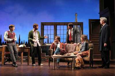 If that subject isn't for you, there are still pleasures to be had here, but you'll have to work harder to find them. With this play, which was originally produced in New York in 1986, Gray may have been returning to the publishing and university settings he had previously investigated in Otherwise Engaged and Butley, but his goals were decidedly more mundane. Although his characters begin at Cambridge in the mid 1960s and progress through a turbulent decade and a half of societal and self-inflicted turmoil, the work is less a critique or satire of their attitudes than (yet another) exploration of how who you may want to be is often very different from the person you'll become. It may not be an especially original notion, but at least Gray commits to it right from the opening scene. That's when, at Cambridge, we meet Stuart (Josh Cooke), the founder of the central journal (which shares the play's title), who's as dedicated to propagating careful craft and criticism as he is to his girlfriend Marigold (Kristen Bush). Joining the pair in this endeavor are the milquetoast Martin (Jacob Fishel), the stuffy Humphry (Tim McGeever), the achingly virginal Nick (Lucas Near-Verbrugghe), and the stressless gadabout Peter (Kieran Campion). All they seem to have in common are their youth, energy, and aspirations, but otherwise they're a toxic sextet. Gray proves this over the course of the following three scenes, in which the plots and passions he establishes are furthered then exploded as Stuart struggles to keep the publication and his life with Marigold afloat, Martin becomes an intermittently destructive catalyst in Stuart's life, Humphry loosens up with disastrous consequences, Nick becomes a chain-smoking womanizer usually on the verge (and sometimes beyond it) of selling out, and Peter finds himself bound by chains he had once never considered. The overall effect is very much along the lines of Merrily We Roll Along, with young idealism giving way too easily to an acerbic, jaded middle age. (Like Merrily, the final scene even yanks us back to the past's earliest, happiest times.) For all its faux pretensions, this is ultimately an extra pulpy soap operacharacters and situations change on a moment's notice, and are usually upended completely in the years-long gaps between scenesand greatly benefits from having the juice of one. Kaufman instead emphasizes the emotional truth and psychological depth of the play, but rarely to effervescent effect. His overly serious and visibly weighty style, which of course infects the actors as well, hampers the fun of the first scene and disrupts the ideally addictive nature of what's to come. This may make The Common Pursuit more real, but it also lessens its edge because we don't see the necessary evolution (or, perhaps more appropriately, devolution) of the people we're following. The play becomes, then, a collection of snapshots of simmering discontent that are not given the opportunity to boil over. Granted, the performers all have serious trouble linking the hopeful twentysomethings of Act I with the battle-scarred middle-agers they must play after intermission, in no small part because they all appear much darker and older than the script demands. (Only Marigold believably develops over the story's 16-year span, with Bush nicely charting how her choices come back to haunt her.) But because Kaufman stages the word rather than the spirit of what Gray wrote, neither they nor you have much of a chance. Even Derek McLane's scenic design, an uncomfortable blend of two- and three-dimensional set pieces, feels like it's constantly at war with itself. To the extent there's an upshot to this approach, it's that this incarnation of The Common Pursuit is a full-bodied dissection of the question of where the line is between elitism and populism. Grappling with, and often being trampled by, the standards and dreams they believe will sustain them transforms the characters into a heady (and useful) metaphor for both America's shifting political landscape and the effect the World Wide Web is having on the way we write and read today. All this, however, makes Gray's play into exactly the kind of overly intellectual meditation it's always been a deceptive corrective to. Rather than The New York Review of Books, it should be a little more like, well, Vogue.