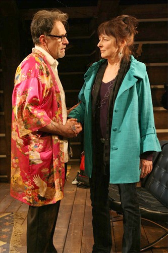 This off-the-hook young woman isn't Britney Spears, and she's not supposed to be the only part of Carly Mensch's new play, Len, Asleep in Vinyl, that's even moderately interesting. But why dwell on technicalities? This slutty yet alluring creature - who goes by name of Zoe, and is played with sour-dope relish by Megan Ferguson - is enough to energize your perception of the present in a way that nothing else in this play remotely manages. Everything else spirals so hopelessly down this Baby Boomer's nightmare time warp, which has been lackadaisically directed by Jackson Gay, that any anchor to today - even a tarty, embarrassing corner of it - is a welcome diversion. From the clothes (designed by Jessica Ford), which include flare-collared men's shirts and a flower-pattern silk kimono (also worn by a man, but never mind), to the characters' unwavering preference to absorb music from LPs rather than CDs, to their frequent references to an iPod demo recording as a tape, this play's landscape is constantly at right angles with reality. That's at least partially intentional, as Mensch sees the world - or at least the portion of it for which rock music is the clearest heartbeat - as in danger of being thrown from its axis by humanity's tendency to deify its most destructive forces. So when superstar music producer Len Moody (Michael Cullen) storms off the stage when he should be accepting an award for Zoe's latest mega-hit, he's making an impact. When he holes himself up in his remote forest cabin "like a rock-and-roll Paul Bunyan," he's making a statement. And when he works to turn things around, both with Zoe and his aspiring "chamber pop"-star son Max (Daniel Eric Gold), he's making lasting change.