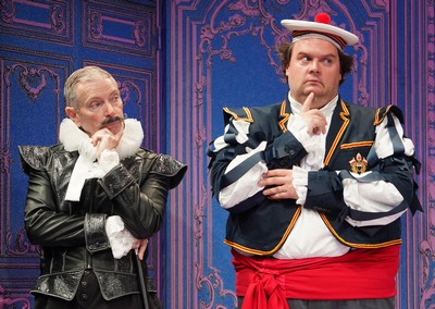 But it's not really about the repartee. Much of which is vulgar: enema jokes; quips about Argan's buttocks, which get therapeutically massaged a lot. No matter: Hatcher is reveling in the rhythms and punchlines of traditional sketch comedy, and he's not afraid to chase a laugh down a blind alley. Hence the many diversions from plot, including several giggle-inducing musical moments. Cléante, pretending for plot reasons not worth going into that he's Angelique's music teacher, improvises a concert, set to the likes of "La Vie en Rose" and "I Dreamed a Dream," consisting mostly of lyrics about sheep. The meta gets hauled out, too: "Monsieur Argan, could you meet me center stage?" And sight gags, involving toilet paper and Sun Ju Kim's hilarious wigs. And a madcap chase, another excuse for Burton to rapidly change costumes. The material isn't all rich, but the playing of it is. Start with Linn-Baker, who both overplays and underplays, and is a seasoned practitioner of both. Stiles is a vigorous, sarcastic foil. Yi displays a comely form, an appealing smile, and a winning cluelessness. Swallow does haughty and calculating like no one's business. Kouatchou, mostly playing straight woman, can nail a punchline when she gets the chance. Daniels, a portly and goggle-eyed Thomas, is especially funny–James Coco with a lobotomy. Burton, we already know from The 39 Steps and The Mystery of Irma Vep, excels at multiple roles, and comes up with three distinct personalities for his trio of doctors: Paul Lynde-prissy for Diafoirus, Darth Vader-like for Fleurant, and unctuously Teutonic for Purgon, sort of Kenneth Mars in The Producers. One feels sorry for Felciano, who isn't onstage long enough to score as many points as his castmates, but he does get to model another hilarious wig. All the actors, and this is crucial, have crack timing; even lines that aren't that funny pay off. Beowulf Boritt's functional set includes some attractive Renaissance filigrees, and Grimes's costumes boast some cheerful anachronisms–slacks for Toinette, a denim jacket for Cléante–that accentuate the ludicrousness. Nina Field and Greg Pliska's sound design, refreshingly, doesn't sound miked at all. Jesse Berger directs his actors to face front a lot, sometimes playing more to the audience than to each other. But that's what Burnett and Caesar and the rest often did, and it feels appropriate. The press release for The Imaginary Invalid begins, "We thought you could use a good laugh these days," and, uh, yeah. Molière's satirical targets are well worn, and Hatcher, to my ear, is mainly colloquializing him, peppering the dialogue with "okay"s and "kind of"s, while tossing in some silliness of his own. Don't expect high comedy or pointed observations about health care. But you may have nearly as good a time as the folks onstage appear to be having, and that seems to be plenty. The Imaginary Invalid Through June 29, 2025 Red Bull Theater New World Stages, Stage 5, 340 West 50th Street Tickets online and current performance schedule: Telecharge.com