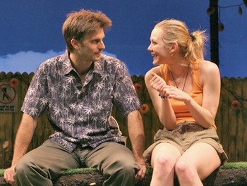 LaBute has rendered their single-minded pursuits of satisfaction at any cost with his most bracing and natural language ever. Pauses, interruptions, and casual turns of phrase that alternately soothe or grate have always been crucial to his work, but have never more effectively conveyed how words and their meanings are quietly sucked out of everyday life, and what this means for the brothers, fathers, and sons forced to communicate anyway. Director Carolyn Cantor has matched LaBute rhythm for irregular rhythm, evoking tentativeness, passion, anger, and the deepest affection from lines that often only obliquely acknowledge these qualities. All that prevents In a Dark Dark House from being the season's first must-see play is Weller. Looking and sounding much like Shane Mungitt, the bigoted baseball player he played in Richard Greenberg's Take Me Out, his Terry rambles and ambles about as though he's on a quail shoot while suffering from a hangover. He evinces no authority over Drew whatsoever, projecting none of the required superiority or age that would convince us of his key role as the unwilling (but hardly unable) guardian of Drew's life. In fairness, Weller was a late replacement for Jason Patric, who exited the production before previews began. But in any play powered by the dynamism of two sparring partners, a single weak link all but ensures a meltdown. Weller's no stranger to LaBute - he originated a role in The Shape of Things - but is uncomfortably located around this crackling fire of deception and uneasy redemption. Livingston, best known for starring in the cult film Office Space, is at home every moment, bringing just the right wounded and wounding off-handedness to a man who hurts others without a second thought. His fear and anguish become yours as he describes, in carefully glancing detail, the horrors he suffered as a boy; later on, when he approaches a still-darker place, he injects creepy doses of comedy that warn (or remind) you that perhaps not everything can or should be taken at face value. Krause brings a satisfying spunk to Jennifer, but can do only so much to ignite her: She's little more than a pawn in a game being played by two very powerful men. Some might scoff at this, seeing her as just the latest female victim inhabiting the more brutal corners LaBute's work. But that's not the case. One of the underlying messages of In a Dark Dark House is that a man's feelings for others are suspect, if not outright nonexistent, until he learns to know and love himself. Making that journey as engrossing as LaBute has here requires a woman to stand by while the men sort themselves out. But taking the play to the next, transcendent level requires a complete cast capable of meeting the demands of the demanding, and devastatingly real, people LaBute has created - if that level is within reach, it has not been attained.