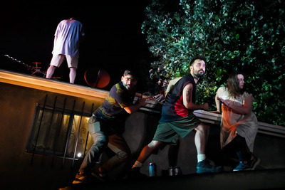 We're in what the script calls "a shitty part of Scottsdale, Arizona," amply reflected in Noll's detailed depiction of a small, eloquently run-down suburban domicile. (Later we're on its realistically designed roof, where the three siblings with no last name used to play, and there's one more major visual coup to come.) From tatty sofa to circa-1975 color TV, it's no place you'd want to hang. It's home to the sixtysomething Joe (Julio Monge), who's even more of a walking disaster than his kids. Ravaged by decades of alcoholism, he's unsteady on his feet, nonverbal except for yells and the occasional discernible word among many nonsense syllables, and given to frequent vomiting. He also hallucinates a lot, conveyed by light and sound cues, though we don't get to share in his hallucinations. Oh, and he may be a space alien. Monge's main tasks are to stumble and howl; these he accomplishes masterfully, though when we transition into a fantasy sequence where he's intelligible and intact, he doesn't seem the same person at all. Also living here, and taking the best care of Joe she can, which isn't good enough, is daughter Angelina (Ceci Fernández), a frustrated lower-middle-class misfit indifferently studying to be a nurse. When brother Ricky (Arturo Luís Soria) comes for a reluctant visit from New York, the fraternal screaming and cursing begins immediately and never stops. It intensifies with the appearance of Ron (Frankie J. Alvarez), the third sibling, an argumentative, hyper-macho auto body mechanic who loves to taunt his gay brother. Caswell doesn't say in his program note which brother is patterned after himself, but I'm betting it's not Ron. And that's what a lot of Wet Brain is: three early-middle-aged sibs squabbling over what to do about Dad, while digging up previous resentments and recriminations. Ricky hasn't visited in ages, having uncertainly leapt into financial executive ranks in New York City and not wanting to return to the scene of a previous crime, where he was gay-bashed by Joe's crew and Joe stood by and watched. Ron's in the middle of a troubled marriage where he's clearly not the injured party. Angelina's stressed out, as who wouldn't be, looking after Joe. The insults fly. And that's mostly the fun part of Wet Brain: three undisciplined siblings shooting the shit and yanking each other's chains. Angelina, to Ricky: "Okay, quick listen, so with Dad these days you wanna try to keep a distance of about four five feet in case he pukes, and don't make eye contact." Ron, to Ricky: "Goddamn, dude, you sound like way more homosexual." Ricky, about Joe: "I don't care what fucking happens to him." Alvarez, Fernández, and Soria have an easy rapport, talking over one another as Ron, Angelina, and Ricky complain, all the while mourning Mona, their long-deceased mother, though she obviously wasn't a model mom. The details of her death constitute a surprise, and help explain how Joe got to be as f'd up as he is. Which leads to, what shall we call it, a collective dreamscape? Noll's set revolves to reveal ... it's hard to describe it, a sort-of overhead view of the sort-of family room, where a reconstituted Mona (Florencia Lozano) dispenses her version of motherly affection: "I wish I were able to feel glad at seeing you all again, but I can't, it won't come." What transpires in this longish scene is, to these eyes, mostly incomprehensible, but it seems to be an outer-space sort of version of the family's ids: the sibs' rivalries receiving an inarticulate airing; Mona reliving her unhappy existence and demise; and Joe explaining why he drank–"first to feel good, then to feel fine, then to feel less, then to feel nothing." Caswell seems to have some strange astral insights in mind about dynamics in fractured families, but amid Cha See's shifting light designs, sound designers Tei Blow and John Gasper's explosions signifying who knows what, and dialogue that often strays from basic noun-verb construction, those insights just didn't come through for me. Dustin Wills, the director, seems more interested in arresting stage pictures then explaining what they mean. As Caswell writes in his program note: "Who needs another sentimental family drama crying over an insidious yet all-too-common disease? O'Neill already did the damn thing anyway." Indeed, and Wet Brain is no Long Day's Journey Into Night. The two share uncaring fathers, brotherly conflict, addictions, and little else. Caswell, we can tell, has been through a lot, and Wet Brain–like any number of contemporary plays, from A Strange Loop to Leopoldstadt–appears to be a form of self-therapy, but what he's trying to say remains maddeningly obscure. If anybody can figure it out, do speak up. Also, if you can figure out what the title means. Wet Brain