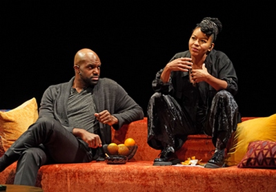 In the fall of 1971, Giovanni interviewed Baldwin for a television program called "SOUL!," which was dubbed the "Black Tonight Show." Produced by Ellis Haizlip, the two-part, two-hour conversation was filmed in London (because Baldwin refused to return to the United States) and was broadcast on PBS in December 1971. The interview takes place in a television studio, and the writers are seated in office chairs throughout. The rest of the set consists of a round coffee table with a prominent crystal ashtray (which practically overflows with cigarette butts by the end of the show). The video establishes intimacy by providing close-ups of the subjects' faces and periodic shots of their expressive hands. Lessons in Survival: 1971, which was created with The Commissary and co-conceived by Marin Ireland, Peter Mark Kendall, Tyler Thomas, and Reggie D. White, re-imagines the context of the interview but retains (most of) the conversation verbatim, including all of the "uhs," "ums," "you knows," and an occasional sneeze. Set in a sunken living room (magnificently designed by You-Shin Chen) with shag carpeting, papaya-orange couches, and a coffee table complete with a faithful reproduction of the large crystal ashtray (also overflowing by the end), the play begins with the entrance of the two performers, Carl Clemons-Hopkins and Crystal Dickinson. They take up the audio devices lying on the sofa and put in the ear pieces, presumably to channel Baldwin and Giovanni. We first hear the authentic voices of the writers from a recording of the original interview (thanks to Lee Kinney's excellent sound design) and are immediately thrust back to 1971. In a miraculous and impeccable auditory transition, Clemons-Hopkins and Dickinson assume the vocal cadence, timbre, and inflection of their real-life counterparts. Both Dickinson and Clemons-Hopkins are splendid and truly captivating. They do not look very much like the actual interviewer and interviewee, and they do not try to visually impersonate Giovanni and Baldwin (Mike Eubanks's costumes are effectively and deliberately anachronistic), but they eerily capture their essences. At the beginning of the interview, Giovanni is deferential to the avuncular Baldwin, who discusses his works and candidly describes his relationship with his abusive father and dependent eight siblings. They address the charged political climate of the late-1960s and early-1970s, and Giovanni references the disparity in their ages (she was 28 at the time, and he was 47). Initially, there is a certain amount of formality in the conversation as Giovanni, sitting a fair distance across from Baldwin, leans into and absorbs his erudite and theoretical explanations of what it means to be Black in America. Under the excellent and unobtrusive direction of Thomas, the mood gradually shifts. The chain-smoking duo become visibly more comfortable with each other, and their comportment subtly and progressively changes. Giovanni takes off her shoes, eats an orange, and nonchalantly perches on top of the couch. Baldwin eventually takes off his shoes and socks, helps himself to brandy, and lounges on the floor. (Of course, none of this blocking is in the original show.) As the interview goes on, though, Giovanni also becomes more and more outspoken (yet still respectful) with her mentor, and this is reflected in the production's staging and design elements. During a heated discussion about relationships between Black men and women, for example, the warm lighting becomes cold and harsh (kudos to Amith Chandrashaker), and Giovanni stalks the periphery of the living-room set. She explains that Black men, like revolutionary Huey Newton, can only be with white women, and Baldwin is defensive and reduced to a series of "But Nikki-," "But Nikki-." The effect is simultaneously incisive and liberating. Occasionally, fragments of the original interview creep in, and there are moments in which the past and present signals mix in a manner similar to the appearance of ghost-like images from another television channel. (People who watched television in the 1970s would appreciate the phenomenon.) There is, for instance, a fleeting projected image of hands touching from the PBS video and there are sputtering sounds of the show's audio. For a short time, the living room set seems to be floating in a sea of television static. (Josaih Davis deserves credit for the outstanding video and projections.) The point is clear: the past is always tightly imbricated within the present. The conversation remains (tragically) as relevant today as it was in 1971. Comments about noted educator and activist Angela Davis coming under legal fire takes on new resonance amid contemporary calls to suppress teaching about racism along with efforts to ban books about race and sexuality. As Baldwin reminds us, "A teacher who is not free to teach is not a teacher." Later, he says, "No tyrant in history was able to read. But every single one of them burned the books." Throughout the evening Giovanni and Baldwin circle around and grapple with the fraught topics of poverty, racism, sexism, and homophobia in America. They are at odds as to how to snap the seemingly unbreakable cycle that perpetuates their existence. Giovanni argues that change can occur, but Baldwin is more realistic. Intolerance seems to part of our DNA. He tells her, "People invent categories in order to feel safe. White people invented Black people to give white people identity." And adds, "Cats who think of themselves as straight invent" gay people. "So, they can sleep with them." Near the end of the evening, Giovanni underscores the importance of poetry, fiction, and activist writing as a means to bring people together and effect positive change. Citing scripture, she says, "The word was made flesh and dwelt among us." Indeed, Lessons in Survival: 1971 does not need holograms and avatars to breathe palpable new life into the thoughts, ideas, and utterances of these two lite