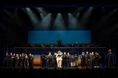 If you've seen it before, grab a ticket while you can. If you've never seen it, grab a ticket while you can. Even without the impossible-to-replicate set design, and with cast members often holding and referring to bound copies of the script (i.e. the way an Encores! production used to be), it is that good. The story of the Royal Mail Steamer Titanic is etched into the consciousness of pretty much everyone in the universe. The actual ship may have sunk long ago, but the account of that calamity lives on, reexamined through books, movies, several traveling exhibitions, and an Off-Broadway spoof that is still playing at the Daryl Roth Theatre. The latter, known as Titanique, parodies James Cameron's blockbuster film, which, coincidentally, came out the same year as the musical. You surely know it, the one about Jack and Rose and a certain doomed sea voyage. Their love story, as memorable and romantic as it is, has nothing to do with Titanic the musical, whose more straightforward telling divides the events into two acts. Act I is focused on the grandeur of the ship, members of the crew, its passenger list representative of First Class, Second Class, and Third Class, and its designated villain, J. Bruce Ismay (Brandon Uranowitz), the chairman and managing director of the White Star Line that operated Titanic. Ismay is seen all through the first act haranguing Captain E. J. Smith (Chuck Cooper) to increase the ship's speed and take the sort of risks that would lead to the deadly encounter with the iceberg. Act II, then, deals with the aftermath of the collision up until the sinking and what would be the loss of more than 1,500 lives. But that's just the facts of it. The glory of Titanic is its grand score, and Encores! has spared no effort to get this right. The orchestra, under the sure baton of guest director Rob Berman, has never sounded better. In true Encores! fashion, the musicians are visible throughout the evening; here they occupy the entire stretch of what would be the upper deck of Titanic, while the cast members generally are spread out below and across the stage floor. There is little room for anything else, but there really is no need for anything but a few unfussy costumes, some props, and great lighting and (thankfully) great sound design by Megumi Katayama, who clearly understands the acoustics of City Center. The score itself is dramatic and lush, as befits the story that is being told. There are echoes of Beethoven, Gilbert and Sullivan, patriotic tunes, hymns, Viennese waltzes, a ragtime number, even, if my ears don't deceive, a nod to Sondheim. There are also a couple of beautiful love songs, including a genuine tearjerker performed by Isidor and Ida Straus (Chip Zien and Judy Kuhn), whose story as it relates to the Titanic is often told, of the long-married couple who refused to be separated even as the ship was sinking. By any measure, this production of Titanic is sheer theatrical magic, with a starry cast that, in addition to those mentioned above, includes Ramin Karimloo, Bonnie Milligan, A. J. Shively, Andrew Durand, Lilli Cooper, and many more terrific actors and singers. The entire affair has been directed with surefire aplomb by Anne Kauffman. Miss this and you've missed something special indeed. Titanic Through June 23, 2024 City Center Encores! New York City Center, 131 W 55th St. (between Sixth and Seventh Avenues), New York, NY Tickets online and current performance schedule: NYCityCenter.org