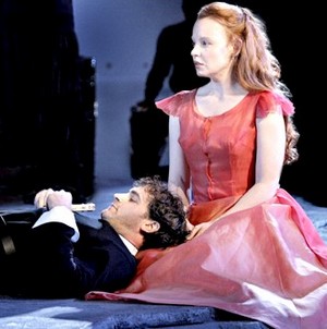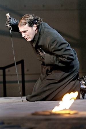 The Danish prince first appears bitter and brooding, swathed in black from his foot to his hair, which is slicked back with the precision of an irrepressible obsessive-compulsive. Sitting on his suitcase and pondering those universe-twisting infelicities that always float through Hamlets' minds, he's the very picture of denial. No, his eyes scream during the rare occasions he looks up from his dazed reverie, this can't be happening. What young man hasn't felt the same upon his own father's death? Granted, not every college student must cope with his father's brother assuming the throne and his mother marrying the new king before her husband's body is cold, but those are just details, details, details. This, of course, leads to bargaining and anger, as Hamlet assumes the charge set forth by his father's restless ghost, who demands his son's fealty in pursuing the ever-noble art of revenge against the murderer (and new king) Claudius. Depression ensues - and ensues, and ensues - when the young Hamlet's traps for his uncle don't spring properly. Then there's finally acceptance, when Hamlet holds aloft the skull of his one-time playmate Yorick and realizes with piercing clarity the ultimate fate that awaits him. There's a pleasing synchronicity to all this, which gives both Stuhlbarg and Oskar Eustis's rigidly intelligent mounting a vital locomotion through over three hours of percussive existential extemporizing. One would think that if anyone could humanize this clinically cynical an interpretation, it would be Stuhlbarg: The appealing young actor has demonstrated in plays as diverse in substance and style as The Pillowman, The Voysey Inheritance, and Measure for Pleasure a keen ability for juggling the countless conflictions of young men at major emotional crossroads.