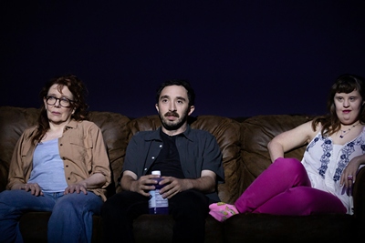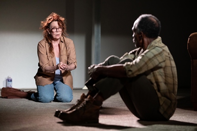 To coax Ginny out of her malcontent, Christopher proposes engaging Lot to help her write a song. Lot's reluctant, and at first it doesn't go well at all. Yet as the four increasingly interact, and spend an enormous amount of time talking about dreams and ghosts and pterodactyls, something like a family forms. And Ginny does eventually write that song, which is uplifting, though it isn't good. Arbery's point seems to be about how we fashion shared realities and supportive relationships out of what we're given, which often isn't a lot. It's a point worth making. But did it have to be made this slowly? No way Corsicana has to run two hours forty-five minutes, unless Arbery and Gold mean to evoke the meandering passage of time in places like Corsicana. If that's their intent, they accomplish it too well. Dagger nails a difficult Act Two monologue about a letter from his mother that may have been divine intervention, and Brewer, who does have Down syndrome, is quite winning, convincing us of both Ginny's inconsistent moods and the special insights and empathies of which people who have Down syndrome are sometimes capable. Justice is the liveliest and most engaging character, or maybe it just seems that way because Deirdre O'Connell is playing her. So precise, this actor, with such presence, and the uncanny ability to shift rhythms in mid-sentence. She also has an unusually poetic speech about love and the complexity of her parents' marriage, and she nails that. Qween Jean's costumes are as unassuming as we'd expect Target-shopping people in Corsicana to wear, and Justin Ellington's sound design is refreshingly natural–it hardly feels like it's there, which is delightful, until the actors occasionally mumble and keep punchlines out of earshot. Corsicana is about caretaking, and the caretaking we witness onstage can be touching, as when Ginny counsels Justice on romantic possibilities with a wisdom and exactitude we wouldn't have thought she had in her. But there's also a lot of small talk, God talk, needless repetition, and some truly terrible songs. Arbery appears to have written the play as a valentine to his sister, whom he clearly loves a lot, and to reveal the specialness and needs of those with Down syndrome to those of us who haven't had a lot of firsthand experience with it. But it's hard to construct taut drama when most of the characters, like Christopher and Lot and Ginny, are often inarticulate. Also, when they're just not all that interesting. Corsicana