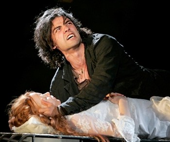 Their meddling confidants - Juliet's nurse and Friar Laurence, respectively played with comic urgency and celestial abandon by Camryn Manheim and Austin Pendleton) adroitly balance with grown-up know-how the excited indiscretions of the young duo. You believe they want the seemingly impossible to work out for the best, and as long as director Greif devotes himself to Romeo and Juliet's story, you can relate. But it's when it comes time for explaining why Romeo and Juliet are in such dire straits that Greif and the other cast members forget they're in a story larger than that of a summer romance novel. Except for an opening fight scene, in which swords, sticks, and oranges are weapons wielded with equal measure, and the touching reconciliation at evening's end, the Montague-Capulet feud is rendered in broad, unspecific strokes. Romeo's best friend, and the prime propellant for the play's catastrophic second half, Mercutio has been reconceived as the star comic role. He's played by an uncommonly grating Christopher Evan Welch, who's gone too far in shedding the likeable Everyschlub persona he's cultivated in his recent New York appearances and made a crucial character a crude Jim Carrey knock-off. Juliet's cousin Tybalt is played with a stately but declamatory grace by Brian Tyree Henry that sucks the youthful energy out of the Capulet's side of the matter. When both Welch and Henry tilt together, as they inevitably must, sparks don't exactly fly. Without their fevered rivalry and its disastrous outcome, the stakes in the first half of the play never seem high enough. You also lose a vital parallel consideration of the Romeo-Juliet pairing, and can't see all the ways the later generation is paying for the sins of its elders. Romeo and Juliet might be the catalysts for change, but Mercutio and Tybalt are the casualties who give another sobering human dimension: These passionate young men shouldn't have to die, either. Greif's focus on Romeo and Juliet (which has involved a judicious trimming of the text) pays off in the production's piercing second half, when coincidence and fate more speedily guide Romeo and Juliet to their destinies. But he spends too much of the rest of his time overusing the enormous shallow pool of water that's the most notable feature of Mark Wendland's rotating set: Mercutio mercilessly splashes and slurps it, bridges cross it, and other actors trudge through it in boots, all to no noticeable avail. The performance I attended was on an unusually cool night, when the wind swept harsh chills through the audience - forcing drenched actors to endure this seems almost cruel. Luckily, the heat returns when Isaac and Ambrose reassume center stage, bringing with them some of the most memorable scenes and speeches in English-language drama. You understand, every time they speak, how Romeo and Juliet gained its reputation as one of history's most lovely and lyrical plays. But with so much of the contrasting ugliness missing from Greif's production, you're not aware of the deeper meanings every bit as important to Romeo and Juliet when it's at its tip-top best.