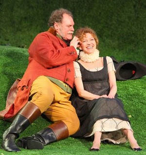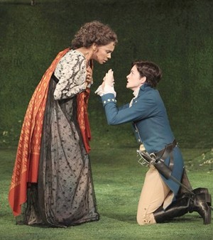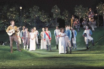 An overactive analyzer could draw a correlation with the overall concept. Jane Greenwood's costumes; the utterly delightful folk music background, and accompaniment for Shakespeare's timeless lyrics, from the indie group Hem (orchestrated for violin, guitar, Irish flutes, uilleann pipes, and more), and Mimi Lieber's blissfully bouncy choreography pin the action firmly on the Colonial countryside, when the New World was still very new. Are the characters the first colonies, uniting beneath love and devotion to form the warmly accepting America? Maybe. But a more satisfying explanation is that, with all these talents working at the top of their form and with no goal of self-promotion, brilliance was the only possible result. How else to explain the presence of Pittu, so ideally cast as Olivia's clown, Feste, that his blend of grave wit, gravelly buoyancy, and creamy baritone almost seem like the role's basic requirements? The de facto narrator and coryphaeus, he glues together the action and is its foremost promoter as a melodic chronicle that always develops from Orsino's often-quoted opening line, "If music be the food of love, play on." One doubts that this music is intended to cease anytime soon. That suggestion comes courtesy of the production's sole discordant note: John Lee Beatty's set, an ostensibly gorgeous depiction of rolling green hills that uses only half of the stage, leaving ugly expanses of black at the left, right, and front perimeters, and impeding the direct connection between the Delacorte's playing area and the Park beyond. Yet the set looks just wide and deep enough to tuck within the frame of a Broadway proscenium. Where Sullivan and Beatty are concerned, coincidences like this don't go down easily. Not that this Twelfth Night, joining the Off-Broadway revival of Our Town as one of New York's few must-see plays right now, shouldn't hit the Main Stem after it concludes its Park run on July 12. Shakespeare this lively and this original deserves to be seen whenever it manifests itself. As the cast sings in the exultant finale, "We'll strive to please you every day." This astonishing group is already living up to that promise, and could - and should - carry it on for much longer.