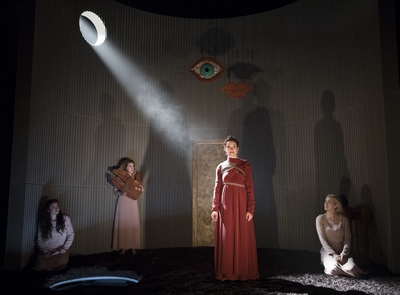 The show's creator is perhaps best known for her portrayal of Marya, Natasha's strong-willed guardian in Dave Malloy's Natasha, Pierre, and the Great Comet of 1812. But she does have many other acting credits to her name (she recently was the Queen of Hearts in Alice By Heart), and she also performs regularly with her band, Grace McLean & Them Apples. Still, if the 90-minute In the Green is her first full length theatrical work, it makes for an auspicious beginning along a new career path. Abstract, though not so much that you can't follow the plot, In the Green is a fascinating work. It is filled with music that ranges from Gregorian chant to every manner of voice sounds, ranging from tonal song to atonal dissonance, explosive bursts of breath, ululation and yodeling, some of which is digitally captured and replayed like distant echoes. All of this is unexpectedly beautiful (and beautifully performed), even in its unfamiliarity, and it is accompanied by a quartet of talented musicians on keyboard, bass, drums, cello, and qanun, an instrument that resembles an autoharp, at least in appearance. As for the plot, only the barebones outline is taken from Hildegard von Bingen's real life story, but even that much biography is something we would most likely find to be rather out of the ordinary. When Hildegard was only eight years old, her parents brought her to be raised in a nunnery that was attached to a monastery. There she was left in the care of Jutta von Sponheim, who lived a totally cloistered life of prayer and meditation. They were locked away together for three decades. That is the basis for In the Green. It's an unusual tale, indeed, at least as it is presented. Three women (Rachael Duddy, Ashley Pérez Flanagan, and Hannah Whitney) simultaneously play Hildegard. One carries a large eye. One holds a pair of lips. One has an oversized hand. It's altogether mythic and Jungian in its depiction of a young girl and, later, of a woman who thinks of herself as damaged and broken. Her mentor Jutta, played by Ms. McLean, has her own brokenness to contend with, and she sees hard work and prayer as the only road to redemption. Most of the physical labor has to do with perpetually digging into the dirt floor of their cell. The great set design by Kristen Robinson and costumes by Oana Botez contributed tremendously to the overall effect. There are many surprises along the way, and it is amazing how much can take place in such an enclosed space. For a new and experimental work like this, there are really only a couple of bumps along the way. There is some deliberately anachronistic humor tossed in, mostly pertaining to the monk who is in charge of the keys, and there is an oddly satiric coda dealing with Hildegard's life after she has finally left the cell. The message seems to be that, in the twelfth century at least, women are more empowered and better off when among members of their own sex; they only become corrupted when they are part of the general society. It's an intriguing notion, but that coda lends a discordant note to the story. In the Green works best when the players are confined to their cell. And musically, this is a score I hope will be recorded so that I can listen to it over again.