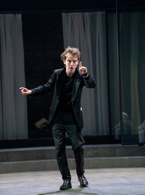 This is a production that mixes art with artifice, with an overlay of quirky design elements that, even when they clash with the onstage action, rarely fail to engage. Both Shakespeare aficionados and newbies will find much that is exciting and rewarding here. That's saying a lot for a play that runs over three-and-a-half hours and is performed as written, in Elizabethan English and the blank verse of unrhymed iambic pentameter. Rather like director Ivo van Hove, Robert Icke has a penchant for incorporating video imagery into his productions. But unlike van Hove, whose use of videos in West Side Story often supplanted the human performances, Icke is more restrained and (reasonably) logical in his choices. But before we get into the design elements, which also embrace some interesting audio components, let's focus on the performances and Icke's direction of the actors. To begin with, Alex Lawther's portrayal of Hamlet is truly inspired. His performance combines an outward display of intellect, sarcastic wit, and youthful condescension with an agonizing internalized anxiety that brings to mind the method acting style of a James Dean or a Marlon Brando. At 27, Lawther has the look that embodies the Hamlet he is performing. Dressed all in black, thin as a wisp, and full of unpredictable mannerisms and mood swings, he is the embodiment of a self-important child of privilege who has been left to his own devices for far too long. Under other circumstances, he might wind up like Prince Hal, who evolves before our eyes in Shakespeare's "Henry" plays from the rowdy ne'er-do-well companion of Sir John Falstaff into the glorious Henry V. Ah, but Prince Hal never had to contend with the revenge-seeking ghost of his murdered father. We first encounter the ghost (David Rintoul) as a solitary figure who appears on a surveillance screen, spotted by Elsinore Castle guards and Hamlet's pal Horatio (Joshua Higgott). The screen gets all staticky and the image lasts for but a short time, but it is definitely there. (I thought for a moment that the ghost would climb through the screen, as in the Japanese horror film Ringu. Now that would be a coup de théâtre!). But old Hamlet Sr. will only speak directly to his son. When he does, their conversation is short: Dad was murdered by his brother Claudius (Angus Wright), who, in short order, married the Queen, Hamlet's mom Gertrude (Lise Bruneau filling in for Jennifer Ehle at the performance I attended) and took over the throne of Denmark. This is all it takes to send young Hamlet, who is already miserable and mopey, over the edge and into a downward spiral which, in this production, leads not to feigned madness, but to the real thing. If guns in plays make you nervous, either buckle down or stay away, because more than one shows up as Hamlet grows increasingly out of control. It's hard to take your eyes off Lawther, who manages to make the predictably familiar character into someone who is completely and scarily unpredictable. In truth, no one in the rest of the cast quite matches this amazing performance. Which is not to say there are not very good performances and thoughtful reconceptualizations throughout. I very much appreciated the portrayal of Gertrude as a woman who is not so easily swayed from her own personal wants and desires (i.e. for Claudius and for her position as Queen). Kirsty Rider's Ophelia is likewise fascinating to watch as her own mental state dissolves before our very eyes. There's also a clever rethinking of the usually near-invisible and interchangeable characters of Rosencrantz (Calum Finlay) and Guildenstern (Jacqueline Jarrold at the performance I attended, filling in for Tia Bannon). All of the changes in characterization work quite smoothly, without interfering in the least with Shakespeare's majestic language or storytelling prowess. The entire cast seems to heed Hamlet's instructions to the company of traveling players by speaking "trippingly on the tongue." No full-throated emoting here, nor is it needed. The play's the thing, after all. Getting back for a moment to the design elements, Hildegard Bechtler's set makes excellent use of the depth of the stage area at the Armory, through the use of transparent sliding screens and curtains through which we can view some of the action. Natasha Chivers' lighting design is suitably dark to match Hamlet's mental state. And video designer Tal Yarden, who has previously worked with Ivo van Hove (Network on Broadway), is responsible for the video work here, which includes the use of various projections, a Zoom meeting, and what are meant to be televised news reports, starting with images of the funeral of Hamlet's father. Interestingly, these all pretty much work effectively and unobtrusively. The one truly puzzling design element consists of the musical interludes, which include some folksy tunes written by Laura Marling and, inexplicably, a number of Bob Dylan songs, as if left over from Broadway's Girl from the North Country. Make of that what you will; at least they are entertaining. As is the entire enterprise. Hamlet