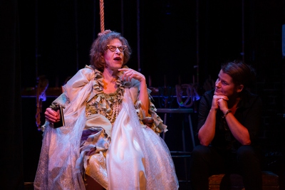 That's when Jackie Hoffman, a reigning queen of chutzpah in a long line of loud and brassy Jewish comics, casually introduced us to her suburban New Jersey character by announcing, "I'm not Jewish, but I have played several." Admittedly, it's a line that does not come off as particularly funny on paper. But as deadpanned by Hoffman, it was unexpected and daft enough to evoke an appreciative round of laughs from everyone in the room. Cleverly, it also served as a conspiratorial nod and a wink that Hoffman knew we were in on the jest and that we surely would be well prepared for the slew of theatrical in-jokes to follow, including more than a few that would reference Hoffman's own career. We meet Hoffman's character, Ariana Russo ("I'm Italian. We aren't known for biting our tongues"), backstage during a performance of Fiddler on the Roof by the "Roselle Park Theatrical Society." She is dressed in layers of gauzy materials and fake pearls and sits locked into a harness that will be hoisted by the fly captain more than an hour later for her entrance as Fruma-Sarah, the deceased wife of Lazer Wolf who appears banchee-like in Tevye's imagined dream in Fiddler. Ariana generally has to wait alone, but tonight she has company, Margo (Kelly Kinsella), the substitute fly captain who is covering for this performance. Ariana eyes Margo warily; after all, she will be the one being flown dangerously high over the stage. But, in truth, she is happy to have someone to talk to during the wait of more than an hour, especially since Brenda, the regular fly captain, tends to disappear after strapping her in. It isn't long before we understand why it is that Brenda walks off whenever she is left alone with Ariana, who indeed does not bite her tongue as she leaps into stream-of-consciousness mode. For the next 75 minutes, she segues from self-aggrandizing anecdotes to sarcastic comments about her fellow thespians to resentment and self-pity, fueled by frequent gulps of bourbon that she keeps handily in a nearby flask. For her part, Margo, the hapless substitute fly captain, does her best to provide a sympathetic ear and sufficient encouragement to keep Ariana together until it is time for her entrance. Within the play's layers of comic lines, what emerges is a strong sense of how important this gig is to both women. It is a piece of their lives that, however briefly, removes them from disappointment in others and in themselves, and allows them a sense of fulfillment they are otherwise missing. What lies beneath Ariana's brazenness is a failed marriage, a failed relationship with her daughter, a failed career, and a dependence on alcohol that she attempts to cover up with her brash persona. For her part, the younger Margo sees in Ariana all of the pitfalls she is trying to avoid while living up to her own real-life responsibilities. Fruma-Sarah (Waiting in the Wings) is built on a foundation of tropes, truisms, and in-jokes about the world of community theater. As such, it is likely to find a long and happy life among amateur companies across the country where productions of Fiddler abound and Fruma-Sarahs wait interminably in the wings. For now, however, it serves as a glorious forum for Jackie Hoffman, whose performance, under Braden M. Burns's direction, brings her character resoundingly to life.