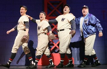 That description of one ageless man's machinations in the fields of arson, mayhem, and other general-purpose do-baddery is just as apt when applied to the musical in which it's so slaveringly sung. Damn Yankees has never been much more than a decent show propelled to classic status by those involved in its inaugural production - today, there's no shortage of creaks to accompany its demonstration of workmanlike Golden Age know-how. Now this almost-but-not-quite-first-rate title is receiving an almost-but-not-quite-first-rate revival at City Center. This second-annual entry in the Encores! Summer Stars series is, in many ways, a vast improvement over last year's anemic Gypsy, looking as opulently appointed as that show did (and, as it's now on Broadway, does) bargain-basement dowdy. But even so, this production highlights the limitations of the Summer Stock on 55th Street format as much as it does those of the musical itself. If nothing else, director John Rando and musical director Rob Berman show considerable fidelity to the original script and score, allowing the viewer a much clearer vision of the 1955 musical than could be obtained from the heavily rewritten 1994 revival. They've also packed their cast with some of today's finest performing names who, if not on the same level as the original leads (which included Gwen Verdon and Ray Walston, and nearly all of which were preserved in the 1958 film), at least make it easy to identify the work's considerable strengths and serious weaknesses. Sliding safely into the former category are the songs by Richard Adler and Jerry Ross, which count styles ranging from die-hard romanticism to bump-and-grind vampabout to retro vaudeville specialty. Yet like The Pajama Game, the seeming incongruity never jars - it's as if the full spectrum of American music has gathered to pay tribute to the country's National Pastime. The book, however, is a different story. As written by George Abbott and Douglass Wallop, it's at best functional, a clean if simpleminded adaptation of Wallop's novel The Year the Yankees Lost the Pennant. It charts the story of one middle-aged baseball fan, Joe Boyd, who's so obsessed with the Washington Senators beating the Yankees that he sells his soul to The Man Downstairs for the opportunity to become the foundering club's young savior of a long-ball hitter. Renamed Joe Hardy, he revitalizes the Senators and revolutionizes the game, all while spurning the advances of the devilish Applegate's seductress servant Lola in favor of the doting wife he left to make it all happen. Base-hit jokes are pitched like fastballs, making it into the catcher's glove as often as they don't; sentimentality is as plentiful as peanuts and Cracker Jack; and the story dissolves into nothingness not long after the seventh-inning stretch. Everything works in the most basic of ways, but only the songs sail over the plate with the greatest of ease - nothing of the remainder could be mistaken for a grand slam. So Damn Yankees is more dependent than most shows on the people assembled to bring it to life. If Rando's candy-coated directorial style is somewhat distancing, and not a tight match for the more tender scenes, it efficiently moves the show from beginning to end. The sets (John Lee Beatty), costumes (William Ivey Long), and lights (Peter Kaczorowski) are colorful and lively adornments that operate well within the show's strictures. Berman's orchestra has a terrific, brassy sound befitting Don Walker's excellent orchestrations, but must it, like Gypsy's, ape the tired Encores! idea of being onstage? Such an arrangement restricts the room available for the staging and choreography, the latter of which is the Bob Fosse original (recreated by Mary MacLeod), alternately angular and galumphing, sexy and strident, such a heady mix of dirty-kneed masculinity and sinewy femininity that it deserves to fill the stage. The show also needs stars who can do the same, while transcending the ordinariness of the book and knocking the songs and dances out of the park. Here, most of all, is where Rando's production stumbles.