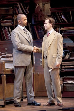 The two men who have each been individually anointed the King of Ragtime are no less than Irving Berlin (Michael Therriault) and Scott Joplin (Michael Boatman). The former came to his title by accident, starting as a poor Jewish immigrant who never took lessons but turned to music to pay the bills, and now that he's a big success still sees songwriting as strictly a moneymaking formula. The latter, on the other hand, is a true struggling artist, who plunked away on bordello pianos as he painstakingly blended black and white into the seamless new sound of turn-of-the-20th-century America. Joplin wants only to make a statement; Berlin wants only to make a buck. That is the only topic of weight Saltzman compels the men to discuss when he unites them, sometime in the mid 1910s, under the premise that Joplin is hoping Berlin will publish his ragtime opera, Treemonisha. Oh, there are momentary detours: We get to see how each man was discovered (Berlin as an on-call improviser in a bar, Joplin peddling his "Maple Leaf Rag" to generally unexcited other-side-of-the-tracks clientele) and how each lost the love of his life almost immediately after marrying her. But the play isn't, and doesn't want to be, about the hearts and souls of Berlin and Joplin. It wants to nudge around the border of art and commerce and ask whether a work can ever be a legitimate success if it doesn't embrace one without the other. This is a difficult approach to make theatrical - forget about entertaining or moving - and Saltzman doesn't make it easier by treating the characters as little more than robotic avatars. "Catchy don't happen by accident," Berlin smarms early on. Later, he cockily admits: "I hear somebody say something like Everybody's doing it,' so I write a tune with that. If the title's a phrase they recognize, they're likely to put down a dime." In describing the impact of "The Maple Leaf Rag," Joplin recounts with history-book fervor: "Ragtime roared into being! At every society ball or back street honkytonk, there was the Maple Leaf Rag.' Four pages of music freed me from having to play for drunks in bars and johns in bordellos. And ragtime saved the nation from European waltzes and polkas." There are the appropriate dollops of mutual admiration society as well, as when Berlin reveals the magic of his "Play a Simple Melody" quodlibet and Joplin quips, "You don't deserve to be this brilliant." (A bonus Joplin barb: "There's nothing more annoying than a miracle.") Or the final scene when Berlin attends the 1970s premiere of Treemonisha with the elaborate reverence of a religious pilgrimage. And both men spend a fair amount of time proselytizing, Joplin even going so far as encouraging Berlin to bleed his soul rather than eke out a dollar ("What do you play for yourself in the dark?"). But all any of this does is shore up these men's professional legends, which - because of their compositions - are in no danger of disintegrating anytime soon. Everything else is too calculated to be enjoyable in any real way. Director Stafford Arima, who brought nonstop jolts of cleverness to the musical Altar Boyz, has provided a lot of static stage pictures that capture all the turgid enthusiasm of Saltzman's writing. Beowulf Boritt's set is uncommonly utilitarian and cheap-looking, an uninspiring collection of turning walls that roughly revolve us into and out of the composers' memories. Therriault and Boatman have a good basic chemistry together, the former's wunderkind inclinations and the latter's sandy weariness blending very capably, but each actor strains against the nearly impossible task of extracting humanity from a sepia-toned philosophical argument. Michael McCormick bubbles over with oily appropriateness as Berlin's business-minded publishing partner, and Jenny Fellner and Idara Victor attractively portray in line and lyric Berlin's and Joplin's romantic and musical muses. There is, however, not a single feeling to be found among them, or the seven other cast members. Such things only appear in the music, which is rightfully recognized as the third lead it is. Though every tune is played from offstage by two unseen pianists (Michael Patrick Walker and Brian Cimmet) and merely "acted" by Therriault and Boatman, they spark and shimmy with an irresistible melodic and syncopated fizz. "I Love a Piano," "Alexander's Ragtime Band," "A Real Slow Drag," "The Entertainer," and a dozen classics of various vintages (which have been smoothly arranged by Walker and Brad Ellis) pierce through their surroundings to captivate and intoxicate as only great music can. But because they're all so lively and everything else so leaden, you can never hear enough of even the tiniest snippets. They also effortlessly answer the question with which Saltzman is so obsessed: If the songs are good enough, the pretense under which they were written doesn't matter at all. Yes, to understand that, one need only listen to the music - everything else is superfluous. Including, ultimately and unfortunately, The Tin Pan Alley Rag itself.