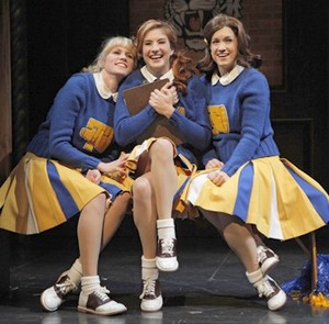That (or some variant of it) is the modus operandi for so many musicals today that theatre lovers should probably give up being surprised. But this abrasively upbeat production, which as directed by Judith Ivey and choreographed by Dan Knechtges started at the Pasadena Playhouse last year and announced a spring Broadway run that never materialized, has shockingly few teeth even for a bubble-gum outing. You would expect at least 32 from a story centering on three small-town Texas girls who live only for popularity in all its forms, but no. By making this "everyone's" idea of a contemporary musical, Heifner and Kirshenbaum have stripped it of any and all timeless bite. This is a radical departure for Vanities, which as a play racked up a mammoth run by its precise skewering of the paper-thin girl mystique and refusal to make any allowances for its trio's vapidity. You saw how they transitioned from high-school cheerleaders to college sorority hotshots and finally untethered adults. You got to know how the socially and sexually adventurous Mary, the obsessive-planner-turned-walking-nervous-breakdown Kathy, and the blindly conservative Joanne became, and maintained or cracked, their one-dimensional facades by questing for acceptance from without rather than from within. The musical has retained the basic characterizations, the conceit of the actresses changing costumes in full view of the audience at mirrored-furniture set pieces (though they look more like armoires than vanities), and the general structure that tracks how the girls mature (or don't) over the next 10 years. What it adds to the story is a "fourth act," to supplement the original three (set in 1963, 1968, and 1974) and suggest that no fence is ever too broken to be mended by sticky platitudes. But without the darker, more ominous undertones on which the original play thrived, the fights and reconciliations along the way are meaningless. The first third of the play ended with the girls blithely waving off President Kennedy's assassination by cheering that that evening's football game would go on as scheduled; the corresponding section of the musical climaxes with a song called "I Can't Imagine," in which the three pledge eternal friendship. It's such reconfiguring that makes this Vanities seem like Kirshenbaum and Heifner's attempt to stake a claim to the theatregoing dollars of young women who've outgrown Wicked and Legally Blonde rather than any sort of an artistic or dramatic statement.
