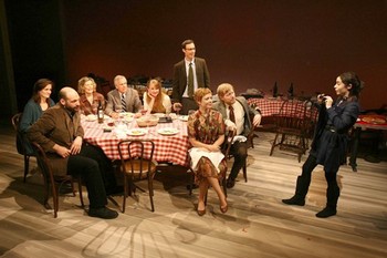 The line comes as part of a softball political debate, one of many Joe finds himself immersed in - or, more likely, immersing others in. But if it immediately sets the stage for Nelson's affectionately biting take-down of long-winded, short-attention-span academics, it sets up another problem for the new Second Stage revival that just opened under Gordon Edelstein's direction: A schematic revival is usually the worst way to present a complex play. So diagrammatic is every aspect of this production, from the performances (beginning with Tom Cavanagh's as Joe) to Edelstein's direction to the design, you're left with the kind of pen-and-ink specificity that illustrates everything except the meaning of what you're watching. If one of the vicarious pleasures of Some Americans Abroad is watching ostensibly high-minded, liberal Northeasterners behave like low-minded fools while immersing themselves in high culture, that's the first thing to be sucked away here. The process begins early, also in the very first scene, when that dinner-table discussion illuminates little more than everyone's barest archetypes. Joe's sparring partner is Philip (Corey Stoll), gruff and energetic but always just stifling his primal urges (in this case, to smack Joe across the face). Frankie (Enid Graham), is drawn and distant, involved but not really until life invades her own sensitive space. Henry and Betty McNeil (Anthony Rapp and Emily Bergl) are inside outsiders, removed from the particulars and fading into the background despite being the most sensible and knowledgeable in view. Clearly delineated eccentricities are crucial, so that as the group progresses on its tour, you see how the destructive contrast between them and the beauty they're mindlessly absorbing. Locales such as the National Theatre and Stratford-Upon-Avon bespeak a rich history these snobbish elitists comprehend only in passing; their forging in the fires of academia, as coupled with their acute Anglophilia should provide no shortage of entertainment. And as the plot unfolds with increasing seriousness, they should be revealed for the dangerous souls they are. But hardly anyone in this production possesses the comic necessity to send you into chortles of recognition one moment, or the blasé emotional cluelessness that should provoke cheek-heating embarrassment at the amusement you just showed. When the group's bickering over bills and complaining about the length of Shakespeare fades away and is replaced by concerns moral (one student's off-itinerary cavorting), educational (Henry's being booted from the tenure track), and legal (no-winking accusations of sexual assault), what's at stake should be more clear than ever. It's not. Edelstein has guided his company to neither parodic highs nor pathetic lows, which results in a flat, uninvolving evening. The spit-shined brochure look of the production, especially Michael Yeargan's sketchy souvenir-scenery sets and Donald Holder's pinpoint lighting, adds a too-creamy texture to a work that exists only for the purpose of letting you savor its lumps. You want to laugh with and at a group whose members are helplessly going through the motions in their lives, without understanding the impetus of each any more than the plays they insist on seeing (yet never seem able to remember). Such laughs, though, also aren't readily evoked by schematic arguments - or performances. Cavanagh is so flighty and disconnected, you don't believe at the outset he could ascend to a position of authority - thus making explicit, and unfunny, exactly that implicit concern. Graham's lip-biting nervousness and Stoll's acridly outgoing manner borrow too heavily from later events, robbing their characters of the surprises that are their only identifying features. Rapp and Bergl are so understated they're almost invisible, offering no clue as to how Henry and Betty are playing others. Most of the other performers, including Cristin Milioti as Joe's daughter and Fiona Dourif as the secret-bearing, skip-away student, are earnest to a fault, as flawless-looking as they'd like to believe they are when they should be anything but. Only John Cunningham, as a retired processor who maintains strong ties to the department, commands sufficient attitude and timing to unleash withering words and phrases with the bracing force Nelson's dialogue demands. You see and hear in him what you should get from everyone: a bravura braggadocio who's lived his entire life according to precepts that define conventional rationality. You believe him because you believe that he believes them. Everyone else seems to be in on the joke, trying to prevent themselves and their characters from becoming the joke. Yet there's no surer way to spoil a joke, which happens time and time again among what should be the perpetually ripe targets of this Some Americans Abroad.