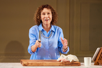 Ostensibly, the central character is the woman to whom the narrator Sammy (Leslie Rodriguez Kritzer) gives the pseudonym of Patty. Patty (Rhea Perlman, who comes closest to shaping her snippets of dialog into a flesh-and-blood individual) is introduced as comfortably well off, "an Upper West Side lady of moderate means." Hers is an insular world, defined by where she gets her coffee, her bagels, her nova and whitefish, and by her trips to her Pilates classes, the theatre, or the 92nd Street Y. Mostly, though, we see her in her kitchen, endlessly chopping away at vegetables on a cutting board; indeed, the constant chop-chop-chop becomes the play's insistent soundtrack. Over the course of 70 minutes, we learn quite a bit about Patty's quirks, her grudges, and the importance to her of appearances. Most significantly, though in a surprisingly underdeveloped way, we learn about her unsettled connection to her adopted daughter Cecile (Arielle Goldman), an up-and-coming artist in her late 20s who has always been troubled and who now, sadly, is addicted to drugs. While we only occasionally get to see or hear directly from Cecile, we do catch the ambiguous feelings Patty has about her. No doubt she is determined to singlehandedly "save" her daughter ("I'm gonna fix this," she says several times), but she also wants to avoid any embarrassing stigma of being seen as personally responsible for all that has gone wrong. "What did I do but love her?" she demands of Sammy. "What did I do???" Apart from the characters of Patty and Cecile, there is that narrator Sammy, the one we have to rely on in order to gain any insights into her aunt and cousin. One possible way to think of her role is to imagine her in a context where the other two are merely aspects in the story of her own life. In a diary? To a therapist? Although Sammy does come off as fairly self-assured, you do wonder about lies underneath, especially when she speaks about her other personal relationships or makes occasional off-topic speeches about the end of the world. It truly is difficult to parse Let's Call Her Patty beyond the bits and pieces we are given. Margot Bordelon's direction and Kristen Robinson's set design give the play a dreamlike quality that is in keeping with a work about memories, unbidden thoughts, and random ideas. But as an audience for a play, we need more than these evanescent wisps. We simply do not know Patty or Cecile or Sammy well enough to walk away with any more than simple impressions about a set of strangers. Let's Call Her Patty