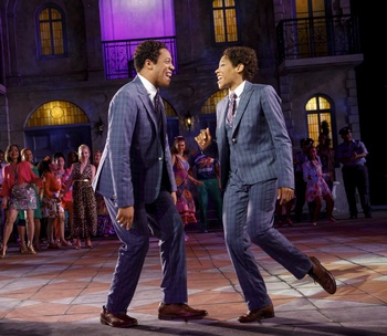 Happily, I can report there were no apparent injuries, and no one's spirits were the least bit dampened by the experience. Indeed, the production, a restaged version of the show that was first seen in a post-season Public Works' presentation in 2016, thumbs its nose at the weather and delivers its own deluge of pure delight. The large cast made up of professional actors and a glorious array of amateur performers from all over New York City retells the classic comedy of twins Viola (Nikki M. James) and Sebastian (Troy Anthony) who find themselves separated and alone, each thinking the other has perished in a shipwreck. Welcome to Illyria, where, pre-show, you will be invited onstage for free popcorn and the opportunity to hobnob with the close to 50 community members who appear in the ensemble. Depending on the performance you attend, they will either be part of the "Red" Company or of the "Blue" Company, a pageantry representing young and young-at-heart residents of all five boroughs and the epitome of the Public Theater's mission of civic engagement and accessible theater for everyone. Yes, the acting, dancing, and singing skills vary among the ensemble members. Yet while the Public Works productions have been, in the past, an "add-on" at the end of the summer season, this very enjoyable version of Twelfth Night, for which Ms. Taub wrote the score, serves as music director, plays the accordion, and appears as Feste the Fool, has been given the full-blown professional, front-and-center treatment. This includes the design elements, featuring Rachel Hauck's solid-looking two-story villa, complete with balconies, a fountain, and shrubbery, and Andrea Hood's grand array of costumes in every color and pattern imaginable. The production follows the story set out by Shakespeare, albeit reduced to approximately 90 minutes in playing time. Viola, finding herself alone and bereft in a strange city, disguises herself as a young man, and, using the alias "Cesario," takes on work as a servant to Duke Orsino (Ato Blankson-Wood). Orsino sends his new aide to woo Countess Olivia (Nanya-Akuki Goodrich) on his behalf. Before you can say "gender confusion," Viola/Cesario has fallen in love with Orsino, and Olivia has fallen for Cesario/Viola. The interactions among the three, under the joint direction of Kwame Kwei-Armah and the Public's artistic director Oskar Eustis, are played with a mixture of broad comedy and tender sweetness, with an especially well-balanced performance by Nikki M. James. In her dual role as Viola and Cesario, she convincingly juggles the feminine and masculine aspects of the character she created for the 2016 production and has since polished to a gleam. Also on hand are two of Shakespeare's great comic creations: the Countess's ne'er-do-well uncle Sir Toby Belch, and her pompous manservant Malvolio. Shuler Hensley is a riot as Sir Toby, never better than when he and Ms. Taub lead the company in a rousing rendition of a late-night drunken party song called "You're the Worst." Andrew Kober likewise shines as Malvolio, who dreams of rising above his station in life to marry the Countess and become, as he sings, "Count Malvolio." Even with all the running around, the very large cast, and the outsized production numbers, it is very easy to follow the plot, which has been boiled down to its essentials and configured into a joyful romantic comedy in which all ends happily when the twins are reunited and confusion melts away. This take on Twelfth Night is as deserving an entry to the summertime Shakespeare in the Park festivities as any of the more traditional productions, such as the straightforward version of Othello that ran through most of June. Pick up a free ticket by joining the line at the Delacorte, at the Public Theater's home on Lafayette Street at Astor Place, or at one of the outer borough ticket distribution locations, or by joining the digital lottery. And, just in case, bring a poncho (no open umbrellas allowed!). Who knows? You may even catch a glimpse of the renowned Delacorte raccoon.