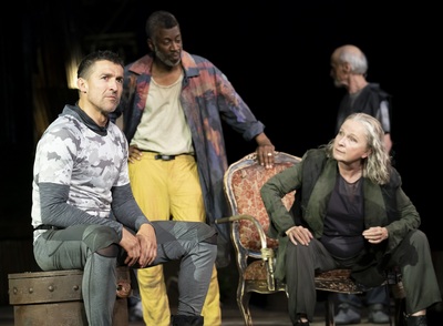 He is not a pleasant fellow, this Caius Martius (the tag "Coriolanus" is added after a military victory against the Volscian city of Corioles), and Jonathan Cake plays him to the hilt as an inordinately haughty member of the patrician class who holds the commoners in utter contempt. At one point, he refers to them as "curs, whose breath I hate" and "whose loves I prize as the dead carcasses of unburied men." And that's to their faces. Behind their backs, he calls them the "rank-scented many" who have the audacity to demand a fair share of grain from the public stores. While he never says "let them eat cake," you get the picture. If Coriolanus were merely about the rise and fall of a bombastic windbag, it would be enough to make its point. But Shakespeare and the emphases placed by director Daniel Sullivan paint a vivid portrait of a governing body that is corrupt to the core, filled with self-important politicos who flip-flop with the wind and gleefully use their powers of persuasion to manipulate the easily-swayed plebeians. Among these silver-tongued snakes are two tribunes (well played by Enid Graham and Jonathan Hadary), who distrust Coriolanus so much that they no sooner work to elevate him to the rank of consul than they set the crowd against him and send him into banishment. And that is just Act I, which ends with Coriolanus ominously proclaiming to his home town foes, "I banish you!" as he storms off into exile and to plot his revenge by hooking up with his former archenemy, Tullus Aufidius (Louis Cancelmi), with whom he plans a scorched-earth assault on Rome. If there is cause to feel any sympathy for Coriolanus, it should come from the portrait of his upbringing by his mother Volumnia, who has raised him to bring to fruition her own ambitions and who works him like a puppet on a string. In other productions of the play, Volumnia has come off rather like the steely and controlling mother played by Angela Lansbury in the 1962 film of "The Manchurian Candidate." Here, Kate Burton downgrades her more to the status of "Tiger Mom," so that Coriolanus's character flaws seem more in keeping with his own nature and less by her self-serving design. A little more monstrous nastiness would seem to be in order. This is, after all, a mother who relishes seeing her son return from battle seriously injured so that she can use the image of his bravery to elevate him to the highest ranks of the government by her friends in the Senate and, especially, by Coriolanus's steadfast friend Menenius Agrippa (Teagle F. Bougere). To underscore the downbeat tone, Beowulf Boritt has designed a set that gives the appearance of a post-apocalyptic automobile junkyard, all corrugated steel gateways, a burned-out car, tires and oil drums, abetted by an appropriately banging clanging score by composer Dan Moses Schreier. I don't mean to suggest the infrequently-produced Coriolanus is not worth seeing; just be aware that this evening under the stars is more "A Midsummer Night's Nightmare" than A Midsummer Night's Dream.