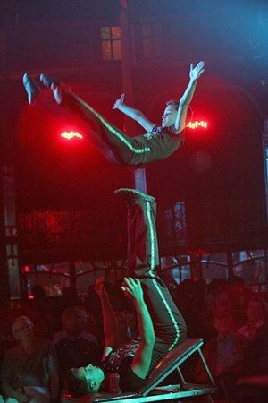 Slicing through the expected roster of gifted (and often barely clothed) adult performers bringing the underworld into the mainstream are Fabio and Giuliano Anastasini. One is perhaps 12; the other can't be much older than 20. But when the elder brother hops aboard a small angled bench and bounces the younger one into the air with his feet, both become ageless. They evoke the perfectly polished work of the world's finest artisans, the ones who create astounding works with such unassuming ease that your first thought is, "I could have done that." Replicating the Anastasinis' work at home, even if your ceilings happen to be high enough, is not recommended. But venturing to Pier 17 at the Seaport to see these two marvelous magicians defy gravity's supposed logic certainly is. Especially if you've never before made a pilgrimage to the Spiegeltent. On the other hand, if you went last year, you might want to think twice. This is not because of the acts' overall quality - if anything, this year's assemblage is brisker, tighter, and funnier than what was seen as Absinthe 2007 - but because so many of the attractions currently on display were also featured then. One expects the crass emcee, the Gazillionaire (Voki Kalsayan) and his broken-down assistant Penny (Anais Thomassian) to return to heckle and verbally abuse the audience by shattering any notions of propriety. But the others are something of a letdown. Julie Atlas Muz's battles with a giant bubble (just large enough to contain her whole body, conveniently enough) and an amorous severed hand. The Willers, who elevate extreme roller skating to heretofore unimagined limits. Adil Rida, the ultra-cut ab-acrobat who sails through the air supported only by fabric strips. They all remain alluring, but lose much of their lustrous wonder the second time around. Physical feats like theirs thrive more in ethereal moments that must be savored than they do in regular repetition that might remind you these people are really human after all. So this year's chief standouts are the newcomers: The alcohol-inclined chanteuse Kaye Tuckerman, who swallows and spits songs as diverse as Jacques Brel's "Carousel" and "Let the Sunshine In" (just in case you can't get tickets to Hair in Central Park), when she's not trolling (and rolling through) the audience; the gorgeous contortionist Princess Anya, also a mistress of the hula hoop; Duo Ssens (Genevieve Landry and Maxime Clabaut), for whom airborne lovemaking (the strictly symbolic kind, mind you) is a passion unto itself; and Duo Sergio (Sergey Petrov and Sergey Dubovyk), two bodyguards who escape the Gazillionaire's employ to strip and balance upon each other in increasingly impressive displays of masculine one-upmanship. But the Anastasinis surpass them all, plunging into their tricks with a youthful vigor that makes them appear to be the most effortless - even though they're probably the most dangerous on offer. Adults' muscles and professionalism you can trust. But a single misplaced foot, an overly aggressive kick, or a split-second head misplacement could spell tragedy for one or both of these young men. That, of course, is why they're so exciting: They're not yet old enough to be terrified, so they're unflinchingly willing to take chances. If Absinthe is to remain a yearly downtown fixture, it needs to adopt a similarly adventurous mindset.