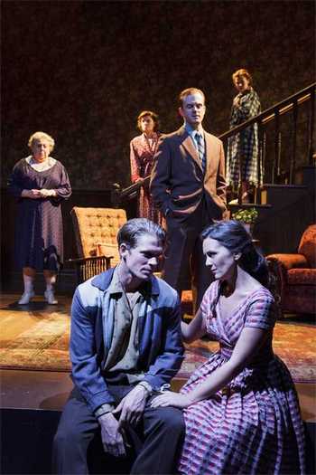 The people depicted in this magical 100-minute evening, which has been directed with copious intelligence and sensitivity by Pam MacKinnon, learn the hard way that others are rarely, if ever, what we think they are or want them to be. And our own prejudices, about matters personal and social, keep us from seeing that we're also never exactly the way we present ourselves to the world. Everyone in all three plays may be from Harrison (Foote's slightly fictionalized version of Wharton), but they may as well live on different planets given how well they relate to one another. Yet neither MacKinnon nor her outstanding company has gotten tangled in this message. It emerges naturally from the mere performance of these plays, enveloping you first in curiosity and then melancholy as you realize that the hopes and fears that make these people mysteries to themselves and to each other are actually holding them back. The only method of true escape is to open up completely, but even in what's supposedly one of the safest places in the world, doing that is terrifying and unthinkable. Examples of success and failure at this drive the third play, The Midnight Caller (from 1956, but set in 1952). The female inhabitants of Mrs. Crawford's boarding house are thrown into hysterics at the arrival of Ralph Johnston (Jeremy Bobb), a handsome stranger, who develops a liking for the whispered-about Helen Crews (Jenny Dare Paulin). Helen is more apt to be sequestered in her room and sob about her lot than socialize, because of a recent falling out with her mother. But Ralph is not afraid to attempt to break through her defenses and prove life can be better than she believes.