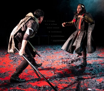 It is, in fact, written in three parts, which director Stephen Brown-Fried has sensibly "adapted" (did he actually rewrite, or just boil down?) into two evenings. Part 1, here labeled "Foreign Wars," depicts the coronation of Henry (Jon Norman Schneider), his betrothal to the scheming Margaret of Anjou (Mahira Kakkar), France's several victories over the British and the role of Joan of Arc (Kim Wong) in securing them, and the growing rivalry, illustrated by the wearing of red or white roses, engulfing Humphrey of Lancaster, the Duke of Gloucester (Mia Katigbak, a NAATCO co-founder), and Richard Plantagenet, the Duke of York (Rajesh Bose). In Part 2, "Civil Strife," York strives to wrestle the throne from Henry, and the struggle continues into the next generation, with Henry's son Prince Edward (Michelangelo Hyeon) pitted against York's son, another Edward, the Earl of March (David Shih) and his bellicose bastard brothers. Along the way, a peasant gets to utter Shakespeare's (or Marlowe's or Nashe's) immortal line, "The first thing we do, let's kill all the lawyers." Oh, and just about everybody dies in battle. Got that? Admittedly, it's a lot to keep track of the original Part 2 alone had over 50 speaking parts, the most of any Shakespeare play, and I'm leaving out any number of subplots in the summary above and much of the first hour or two at NAATCO is spent wondering, Who's he? Who's she? Why are they so angry at each other? This, compounded by the flowery Elizabethan iambic pentameter and NAATCO's frequently gender-blind casting, leaves a lot for us to figure out. Once you've puzzled out the dramatis personae, it's relatively easy to follow, and the emotions rattling across NAATCO's ample stage are strong and affecting. Brown-Fried even manages to draw out a surprising amount of humor amid all the bloodletting, notably in Margaret's rapid transition from a seemingly shy, docile virgin into a ruthless power-behind-the-power bitch, and in her sexual sparring with the Earl of Suffolk (a wily, randy Paul Juhn). There are 16 actors (it feels like twice that), double- and triple- and quadruple-cast, and their skill at line memorization alone is awe-inspiring. That they can also bring subtle shadings to these broadly drawn characters is a tribute to them and to Brown-Fried, whose direction goes well beyond traffic management, though there's a lot of that. His fight choreography isn't the best (he's assisted by "movement directors" Orlando Pabotoy and Kimiye Corwin), and it frequently lapses pointlessly into slo-mo, but he has a way with actors. Besides Juhn's spot-on Suffolk, I'm especially impressed with Katigbak's dignified, wronged Gloucester, Bose's thundering York, Wong's deeply felt Joan, and Kakkar's amoral, calculating Margaret. Schneider's Henry feels comparatively passive, a well-spoken dolt, but that's the part, and he navigates the many soliloquies expertly. Kimie Nishikawa's set is largely a red floor (bloodshed?) covered in shifting gray paper scraps (the ashen aftermath of battle?) and two staircases on wheels, rolled frequently around to represent the throne, battlefield boundaries, and whatever else is necessary. Reza Behjat's lighting is expressive and often just lovely, notably when shining fresh morning sun on Joan. And Nicole Slaven's accent-on-black costumes are rather odd, an irrational mélange of period and contemporary, sometimes within the same getup. But they do effectively point up class differences, a valuable trait when so much of the action is about how easily swayable the illiterate commoners are. Toby Algya's sound design consists of loud cinematic music and louder battle effects, which sometimes drown out the unmiked actors, but thank heaven they're unmiked. That all these warring Brits and Frenchmen are enacted by an Asian-American cast feels neither here nor there, except perhaps to underline the universal themes of conquest and petty jealousies that escalate into political disaster. NAATCO's press release states that the company was drawn to Henry VI as "a cautionary fable on the fragility of empire, and on the horrors that human beings are capable of enacting." Fair enough, but at this particular moment in history, other Shakespearean themes might resonate even more strongly how about the family dynamics of King Lear, or the deluded leadership of Richard III? Still, this Henry affords an opportunity to experience rarely performed Shakespeare in two easily digestible gulps, and very stylishly, too. Do be advised, though: a) It's six hours out of your life, b) you'd do well to first read the Wikipedia entries on all three plays, as well as NAATCO's projected synopsis in the lobby, and c) the language is challenging, and not a little verbose. Excellent as most of it is, this Henry VI summoned up a long-ago memory for me, a quip made by a schoolmate in ninth- or tenth-grade English, after we'd trudged through Hamlet. Shakespeare, he declared, "was basically a gifted hack."