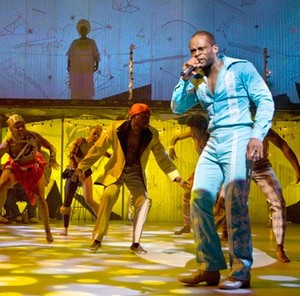 But, oh, that energy. Bill T. Jones, who conceived the show with Jim Lewis and Steve Hendel, who wrote the book with Lewis, and who directed and choreographed it alone, has finally earned the Tony he won last year for choreographing Spring Awakening. This nonstop spectacle of song and dance bumps, grinds, and rumbles with more concentrated force than any other jukebox musical since Jersey Boys. Add a human perpetual-motion machine named Sahr Ngaujah as the title character, and you have that rare kind of musical that doesn't define a kinetic landscape, but constructs one from component atoms. In reimagining Anikulapo-Kuti's 1977 farewell concert at The Shrine, the Lagos nightclub where he frequently held court, Jones has fashioned a conspicuously polished biography of the Nigerian revolutionary who proved that the beat is mightier than the sword. As Ngaujah plays Fela, one of Nigeria's most-arrested men (over 200 times, he informs us with a sly hint of pride), you see in his face all the pain of having his activist mother, Funmilayo (Abena Koomson), murdered in a raid, and the threat of the cops just outside the Shrine, bubbling beneath a more pressing reality: there's a show to do. And Fela wants to ensure that his final performance is as much a tribute to rebellion itself as it is to him and his music. So, yes, he'll pull out his saxophone a few times and wail to crack the rafters. But he'll also take misty jaunts into memory and deconstruct the rhythms of his Afrobeat style and of the erotically charged nyansh dancing he favors ("Some call it funk," he explains), leaving projections and video (smartly designed by Peter Nigrini) and even the graffiti-dressed set (Marina Draghici) to fill in the gaps in a life too politically and personally expansive to ever be contained in a single evening. Trouble does not even arise, as you might predict, from trimming down Anikulapo-Kuti's own songs from 20 or even 30 minutes to four or five. With some new lyrics by Lewis, new music by Aaron Johnson (also the musical director) and Jordan McLean, and shoulder-bustingly brassy arrangements by Johnson, McLean, and Antibalas, they thoughtfully and concisely chart Fela's protests against corrupt governments and the uninvolved citizens that allow them to flourish. The numbers, which ornament everything from a sing-along blessing to the difficult journey ahead, to Fela's plaintive recollections of living with his mother in the public crosshairs, fit snugly into Fela's story and, like the crisp, declarative book, never make a noticeable dramaturgical misstep. One should not, however, underestimate the intoxicating allure of at least partial imperfection. Despite all the audience involvement woven throughout, this rigorously researched and recklessly regimented show is too certain of its own powers of persuasion to need to be completed by anyone watching it. Fela, his muse Sandra (Sparlha Swa), and the eight lithe-limbed females he calls the Queens are so content with themselves, that none of the vivacity that drops from them while swiveling, strutting, and stamping their way through Jones's unstoppably undulating choreography ever really flows beyond the footlights. Because Fela! lets you attend it without being drawn into it, this inherently theatrical musical ultimately feels more like an Academy Award-winning documentary than it does the visceral invocation of suppressed humanity it yearns to be. The most affection you can derive from this explosively sedate evening is for Ngaujah himself, who runs through his marathon star-making role, seemingly without ever pausing for breath. Almost never offstage, and absolutely never off-message, he brings a laser-focused devotion and a supple physicality to his portrayal that practically scrape away his less-than-fully developed ability to shock your heart as easily as your spine. At least he radiates the reckless spirit with which the real Anikulapo-Kuti captivated a nation by blending his songs and his causes until they were indistinguishable. Jones is somewhat less successful at obscuring the show's seams, but there's no denying the great alchemical strides he's already made in identifying Fela and Fela! as uniquely worthy creations. But if the results at this point are far from leaden, they're also not yet golden.