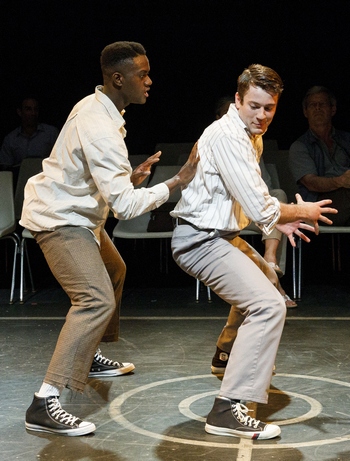 The year is 1951, three years before the Supreme Court ruled unanimously that the very concept of racial separation, an embedded reality in Birmingham, Alabama where the play takes place, was a violation of the 14th Amendment of the Constitution. But in Separate and Equal, the only court that matters is the basketball court, where six high school students, three of them black and three of them white, meet up one day. The black teenagers (Adrian Baidoo, Edwin Brown III, and James Holloway), who show up first, have already been warned by the local police to steer clear; their designated time on the court is restricted to after church on Sundays. Yet here they are on a week day, horsing around and practicing layups when they are confronted by their white peers (Ross Birdsong, Steven Bono Jr., and Dylan Guy Davis). After some initial smirking and chest thumping, the white boys agree to split the court in two so both groups can play. Before you know it, however, the two sides are pitted against each other, and, eventually, they rearrange themselves into two integrated teams. But don't think for one moment that this is some great kumbaya breakthrough. The teens are very much aware of their place in the rigidly prescribed social order, and this deeply imbued understanding affects every one of their interactions. To convey the wound-up tension, the basketball game gradually takes on the form of a modern dance piece, played out through a series of well-executed movements choreographed by Lawrence M. Jackson, with original music by Tom Wolfe. The whole thing has the feel of a Sharks versus Jets confrontational dance out of West Side Story. And while you may catch a glimpse into a more hopeful future when the most rigid rules of segregation will be split apart, you also get a strong sense that all hell could break loose at any moment. There is no actual basketball in play, but Matthew Reynolds' projections keep you apprised of the action around the hoops, as well as disconcerting images of the "separate but equal" water fountains for use by the black and white players. While the interactions among the young men are front and center of the production, the contextual weight of history falls to the adults who come in and out of the scene. If there is a place in which the 85-minute play falls short, it is with its depiction of the generation of the boys' parents. The parallel lives of two of the mothers, the black maid Viola (Pamela Afesi) and "Miss Annabelle" (Barbra Wengerd), the embittered white woman she works for, provide some of the most intriguing though frustratingly underdeveloped moments offered by the playwright, who also directs. There are some wonderful choreographed moves featuring the women that provide a glimpse into their intersecting lives and that leaves a lingering impression, but with too many unanswered questions. The adult men are even more clichéd in the way they are presented. There is Two Snakes (Will Badgett), whose obsequiousness towards the white policemen (Ted Barton and Jeremy Cox) makes him an object of ridicule; even one of the black players refers to him as "Stepin Fetchit." Yet he is always on hand to stand between the boys and a severe beating, especially by Mr. Barton's tough cop character, whose last name is, assuredly not coincidentally, the same as that of the notorious Birmingham Public Safety Commissioner Bull Connor. Finally, there is the father of one of the white boys, a pro-civil rights lawyer called Mr. Finch (also played by Mr. Barton), a name that should be recognizable to anyone familiar with Harper Lee's novel "To Kill A Mockingbird." Truthfully, the sketchy portrayal of the adult characters is problematic and makes the play feel unfinished. Nevertheless, the playwright is to be commended for the inventive use of a basketball game as a metaphor for the troubled history being depicted and for bringing together the themes of age-cohort camaraderie, resentment, potentially violent competitiveness, and even a dash of hope. There is enough inventiveness here so that, despite its shortcomings, Separate and Equal is a worthy entry in the ongoing examination of race relations in America.