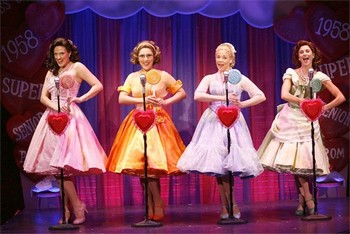 Nutrition (or as close as this show gets) is delivered exclusively by Farah Alvin, the only member of the four-woman cast who convinces you that ensemble work doesn't mean vanishing into the woodwork. She's saddled with the least inherently interesting role possible in a musical about a girl's singing group performing at their 1958 senior prom: Missy, the nerd, complete with glasses, imperviously bobbed hair, and a tentative manner you can imagine usually relegates her to sitting alone at lunch tables. Her diplomatic but neurotic struggles to keep everything together during the Wonderettes' bicker-heavy performance, however, melts away when she launches into Sammy Fain and Paul Francis Webster's "Secret Love." Slicing through an ocean of adolescent soup, Missy unleashes 18 years of loneliness and longing with a violently vibrating belt that belies her carefully cultivated wallflower persona. Missy doesn't just sing the song, she lives it; and Alvin finds in her rendition such tender but unapologetic force, you come to understand just how someone who seemed a perpetual girl is truly a woman after all. And when she elucidates her crush further, to the strains of The Bobbettes' "Mr. Lee," it's with more free-spirited, confident fizz than a street full of soda fountains. Alvin has shone in Off-Broadway musicals such as I Love You Because and If You Give a Mouse a Cookie..., but here she demonstrates a galvanizing talent for transforming the commonplace into the unique. But if she reenergizes The Marvelous Wonderettes's rampant ancient tropes about teen love, she's the only part of it that does. As the other girls, Victoria Matlock (the pompously pretty Cindy Lou), Beth Malone (the tomboyish Betty Jean), and Bets Malone (the streetwise Suzy), all live up to their one-note roles, never diving beneath their stereotypical surface. Cindy Lou's preening and Betty Jean's pranking are as far as the actresses and Bean take these charcoal-sketch characterizations; they're all satisfied with treading through the bop-worthy but vapid songstack ("Mr. Sandman," "Lollipop," and "Stupid Cupid" are typical entries) and the waves of taffeta that comprise Bobby Pearce's cheeky costumes. Bean complicates matters by setting his second act at the girls' 10-year reunion. This allows him a potentially attractive opportunity, to explore how the first act's overwhipped rivalries and romances (ooh, Cindy Lou stole Betty Jean's boyfriend!) morph into adult concerns that mirror the music they now listen to. Instead, he uses it as just a lazy device for shoehorning in a second decade's pop: "You Don't Own Me" as a defiant stand against noncommittal men, Suzy's cry for "Respect" from her old-fashioned hubby, Cindy Lou's reformation and happiness dating the "Leader of the Pack," and so on. Jukebox musicals don't have to be this cheerfully pointless: The (relatively) intelligent storytelling and thoughtful uses of familiar songs in Jersey Boys help it to still hold the standard by which other similar titles must be judged. But though Janet Miller's deceptively energetic stand-and-step choreography here vaguely resembles Sergio Trujillo's there, The Marvelous Wonderettes's void of reality disallow any further comparisons. Except, of course, for Alvin's performance, which does as much for this show as John Lloyd Young's Frankie Valli did for Jersey Boys. Alvin centers a listless evening, dramatically with her evolution from shy to sensual (her romance with Mr. Lee really ramps up in Act Two) and comedically with everything else, giving you someone to root for and care about when nothing else even demands you pay attention. At the performance I attended, she made a fall-down-funny one-act play of collecting prom queen ballots from the audience: At one point, her eyes widened as she spotted a crumpled lump of paper in the aisle, which she picked up and caressed with a loving, terrified despair actresses typically reserve for Tennessee Williams heroines. She then rounded on a nearby (chortling) audience member and berated her at length for violating the sanctity of the voting process, beautifully unifying shrewish schoolmarm and devoted perfectionist into a resolutely believable and hilarious young woman who hasn't yet figured out when to shut up. New York theatregoers will be very lucky indeed if Alvin herself never learns that lesson, either.