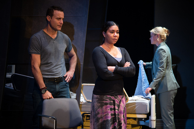 Jasper, the eight-year-old, was born with what one assumes to be (but is never mentioned) severe cystic fibrosis. He has been attached to breathing apparatuses his entire short life, and he has been in and out of hospitals with constant regularity. His parents, Drew (Dominic Fumusa) and Andrea (Jessica Pimentel), have endured unceasing forewarnings that their son is not going to survive the next medical crisis, but they exist in eternal hope that he will be admitted into an experimental drug program and beat the odds. Unsurprisingly, the stress and never-ending vigilance have taken a toll on them individually and as a couple. Drew and Andrea continually bicker, and they are inattentive to domestic responsibilities such as buying groceries and folding the laundry that is scattered around their Queens apartment (which is suitably claustrophobic in the realization by Michael Gianfrancesco, who also designed the costumes). The few moments of pleasure they enjoy together are ones in which they reflect on their pre-Jasper days of dancing, socializing, and leisurely lovemaking. On the train to his construction job, Drew meets Shayla (Abigail Hawk), who is a single mother to four-year-old Tyler and also a high-powered executive. When Shayla spills her coffee on her silk shirt (in a not-quite-believable subway bit), Drew loans her his sweatshirt, and thus begins a fast and intense friendship. Their regular meetings in the park provide the chance for each to experience what it would mean to be in happier parenting situations. He gets to toss a ball and play with a surrogate son, and she takes enjoyment and gratification in watching her child in a nurturing relationship with a kind and decent man (unlike her ex-husband). Naturally, it isn't long before the new-found familial bliss is interrupted as Andrea becomes suspicious of her husband's extracurricular paternalizing. MacDermott addresses important issues about parenting, and there are some affecting moments among all of the conflicted characters. Ultimately, however, the play is unsatisfying as it hints at being more provocative and incendiary than it actually is. The production begins, for instance, with unsettling sounds and flashing lights, and the script contains some insidious allusions to what life might be like without Jasper. (Robin A. Paterson designed the excellent lighting and John Gromada contributed the original music and sound design.) There are even a few dropped insinuations about Drew's interest in Shayla's son. Under Katie McHugh's uneven direction, though, the dark side is unfortunately left mostly uncharted. The play is reminiscent of Amy Herzog's deeply moving Mary Jane, which focuses on a single mother who is struggling financially and personally while raising a very sick child. While that play presents a rich and complicated character study, Jasper seems to skate along on the surface generalities of a Lifetime movie. We get only glimpses of the characters as flesh-and-blood people rather than as individuals defined solely by their relationships with the children. This is a pity because the actors all do fine work with the material they are given. Fumusa is immensely likable and sympathetic as a man torn between two families. Pimentel conveys notable strength even as she is gradually crushed by bureaucratic machinations and ongoing and unsuccessful medical interventions. As the harried single mother, Hawk finds the right amount of humor while negotiating motherhood, institutional child-care difficulties, and a demanding career. Both to his credit and to the possible detriment of the work, MacDermott avoids the maudlin and tearjerking elements of a Lifetime movie. That said, as an inveterate weeper, I would have appreciated some emotional connection even if it were emotionally manipulated and melodramatically manufactured. Except for the final image, which elicited a few gasps from the audience and which was telegraphed long before, I was left generally cold by Jasper. Jasper